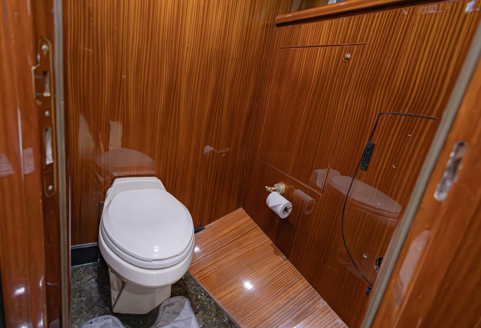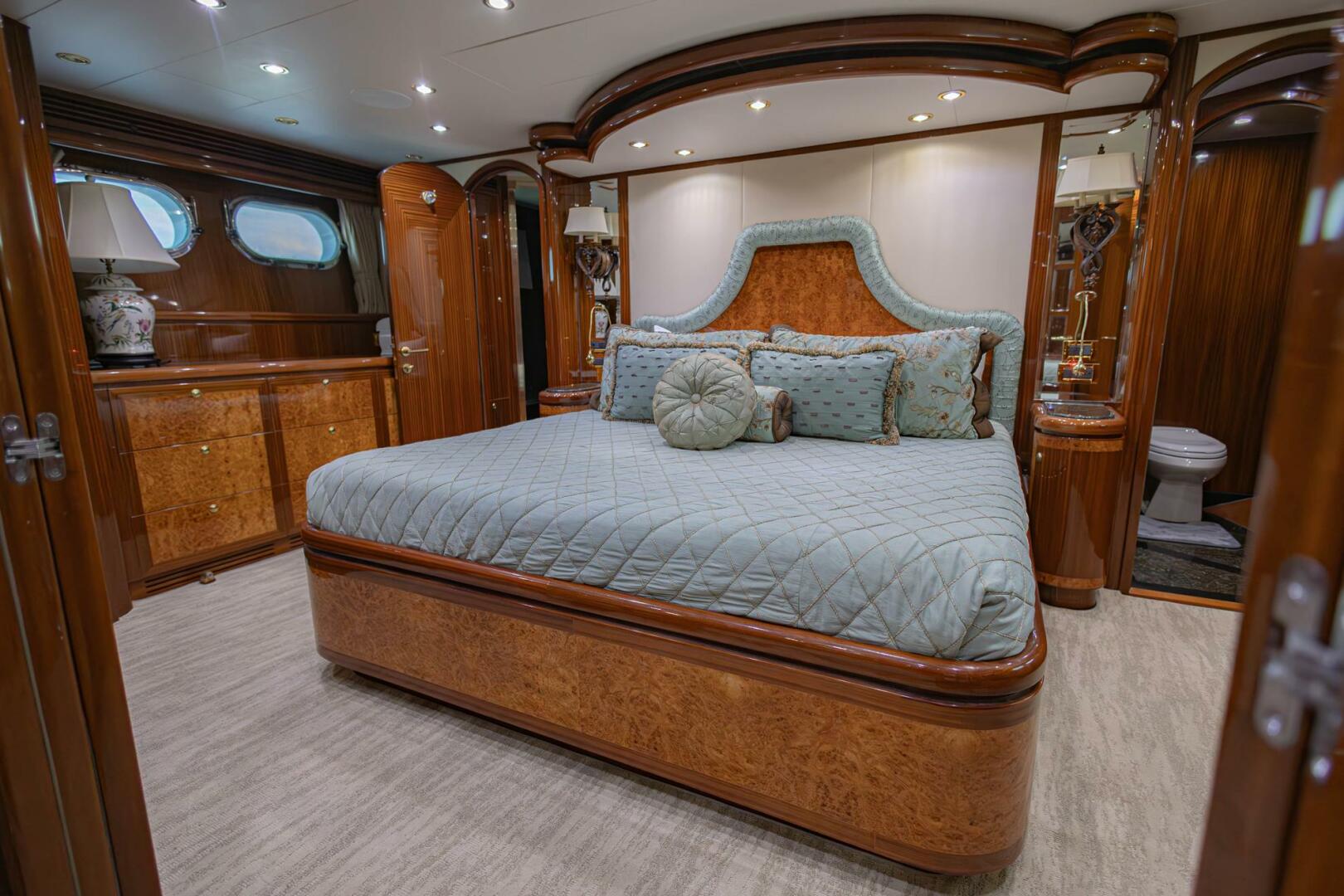 The entrance doors to the master are stunning with a Gloss Sapeli frame and Clear mirror inserts. The King-Sized headboard top roll upholstery with nightstand topped in Green Butterfly granite on both sides. The master head has a granite shower, towel warmer, and a tub. The Engine room can be accessed from both the crew area after and off the master stateroom.