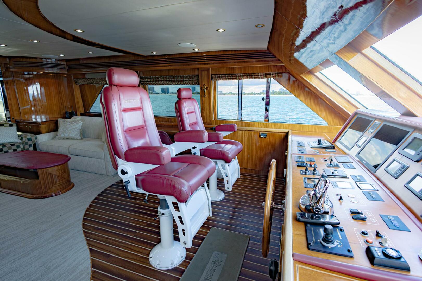 This well-designed gathering space is designate for masculine appeal. Utilizing rich tones and leather upholstery we have created a warm and fabulous space for entertaining guests. The helm station is forward with an impressive instrument console, Stidd chairs and a ships desk.