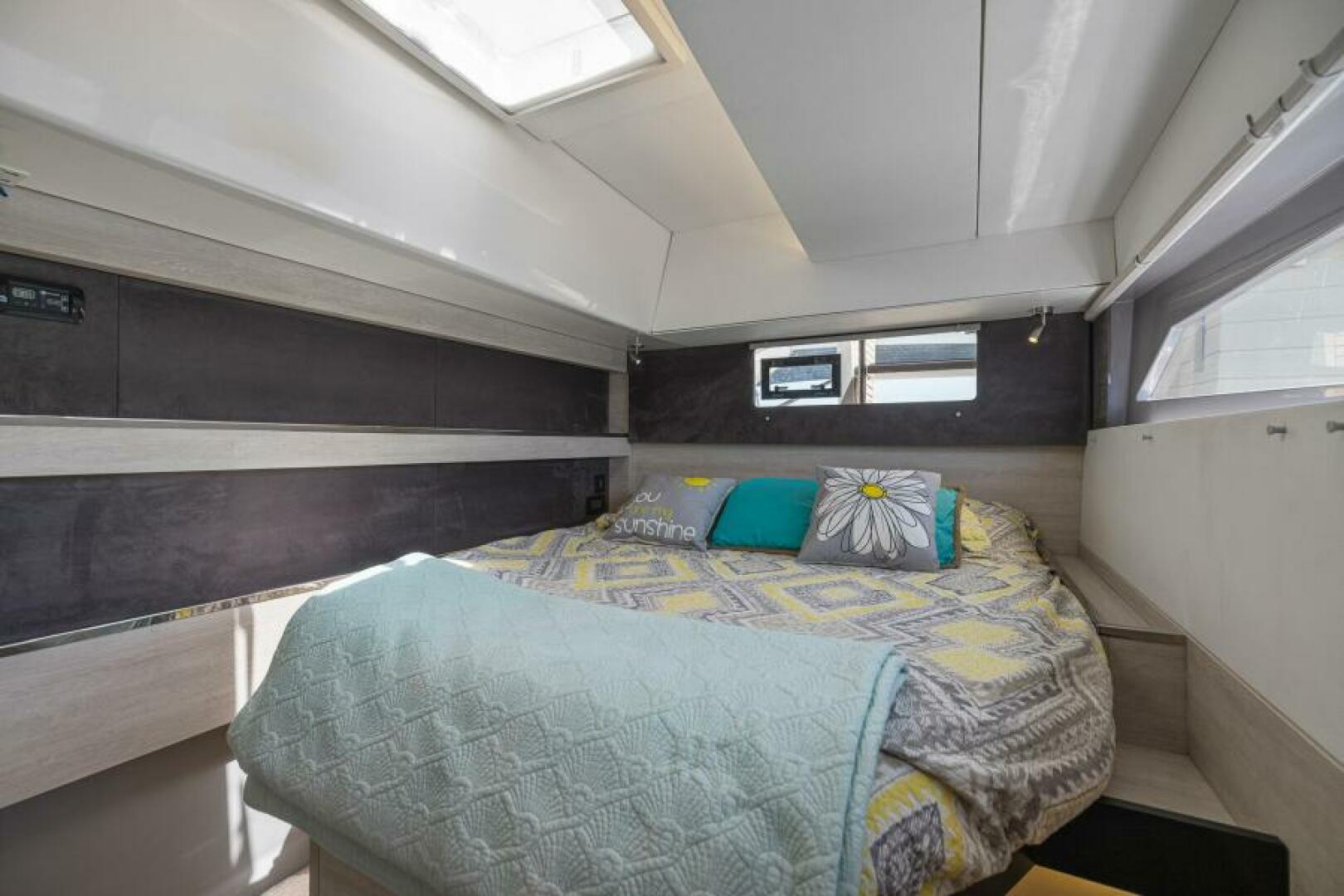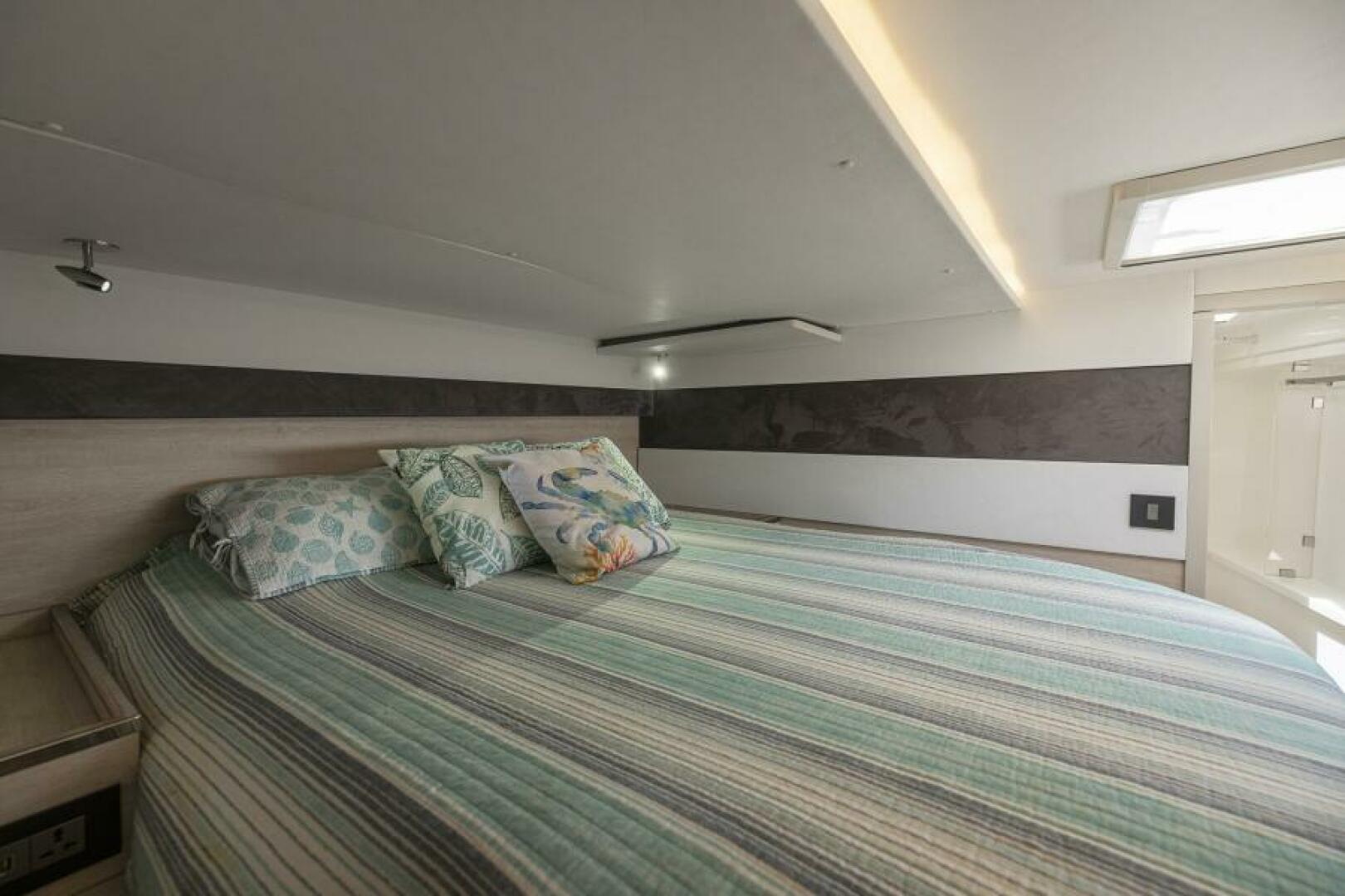 Her versatility begins with the option to choose the classic hard-top exterior configuration (called the Leopard 50P), or for the first time on a Leopard Catamaran of this size, an optional flybridge accommodation (Leopard 50L). The Leopard 50L is the ideal layout for anyone looking for more outdoor living space as she comes equipped with a flybridge that includes a lounge area, table, sunbed and optional exterior speakers and shade awning. Access is provided by floating stairs leading up from the aft cockpit. An important distinction compared to similar sailboat flybridge configurations is that while under sail, passengers can move about the flybridge with ample headroom and never worry about interference from the boom. The flybridge is also situated to still maintain contact with the helm station, an important feature found on all Leopard Catamarans.
