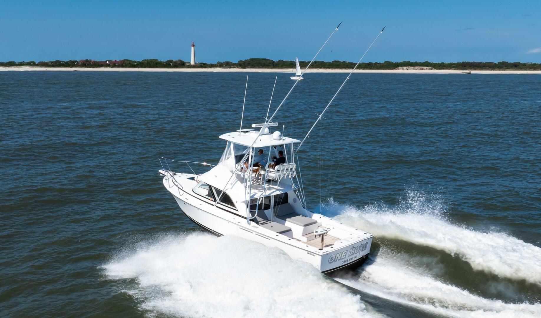 - Modified deep-v hull design, planing type with flared bow, hard chines, lifting strakes and propeller pockets. Hull material is reportedly, solid FRP and below the waterline vinylester resin-infused and vacuum baged closed cell PVC foam sandwich core above the waterline. Exterior finish is white gelcoat with a black boot stripe and black painted house stripe.