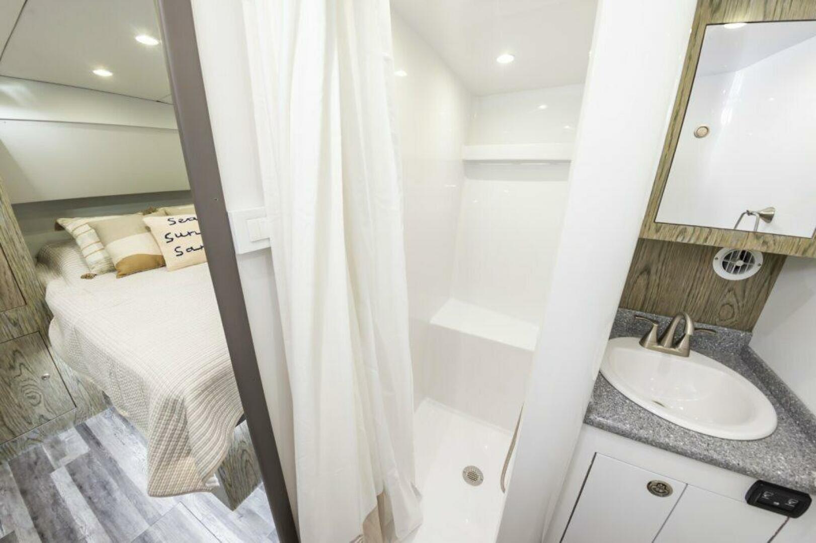 - Forward stateroom features a V-berth with storage under