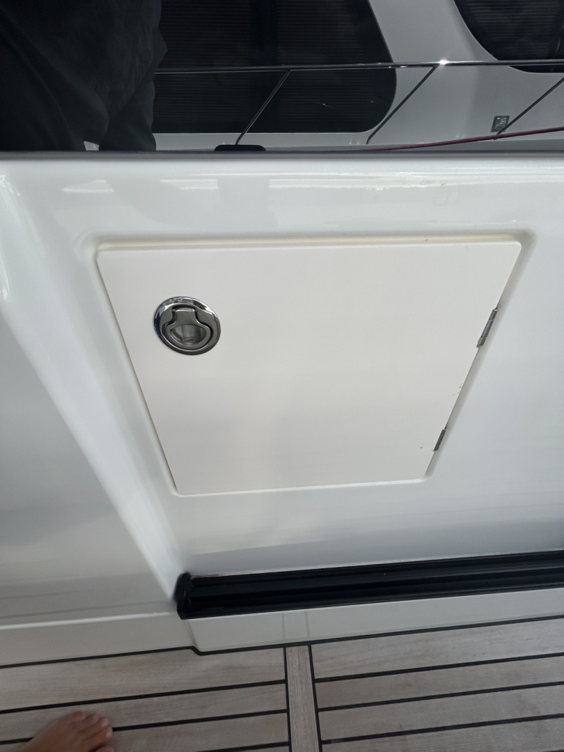 Easily board via starboard boarding gate to walkway, or via fully covered aft deck with starboard transom door and wide teak swim platform the AB 10'6" tender and hydraulic transom mount Freedom Lift for effortless access to the water. Fully covered aft deck has aft settee, which slides back to offer additional space once docked. Access walkway portside or door through to extra wide covered walkway with door to lower helm starboard. Steps to flybridge, and glass pocket doors which open fully to galley/saloon. With the pocket doors fully open, pop up bar opens to deck from galley. Beautiful teak decking, glass doors, custom lighting and storage.