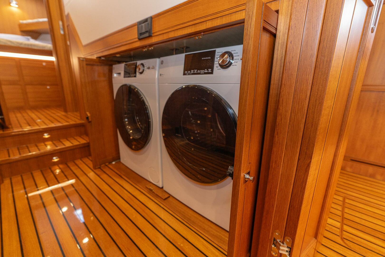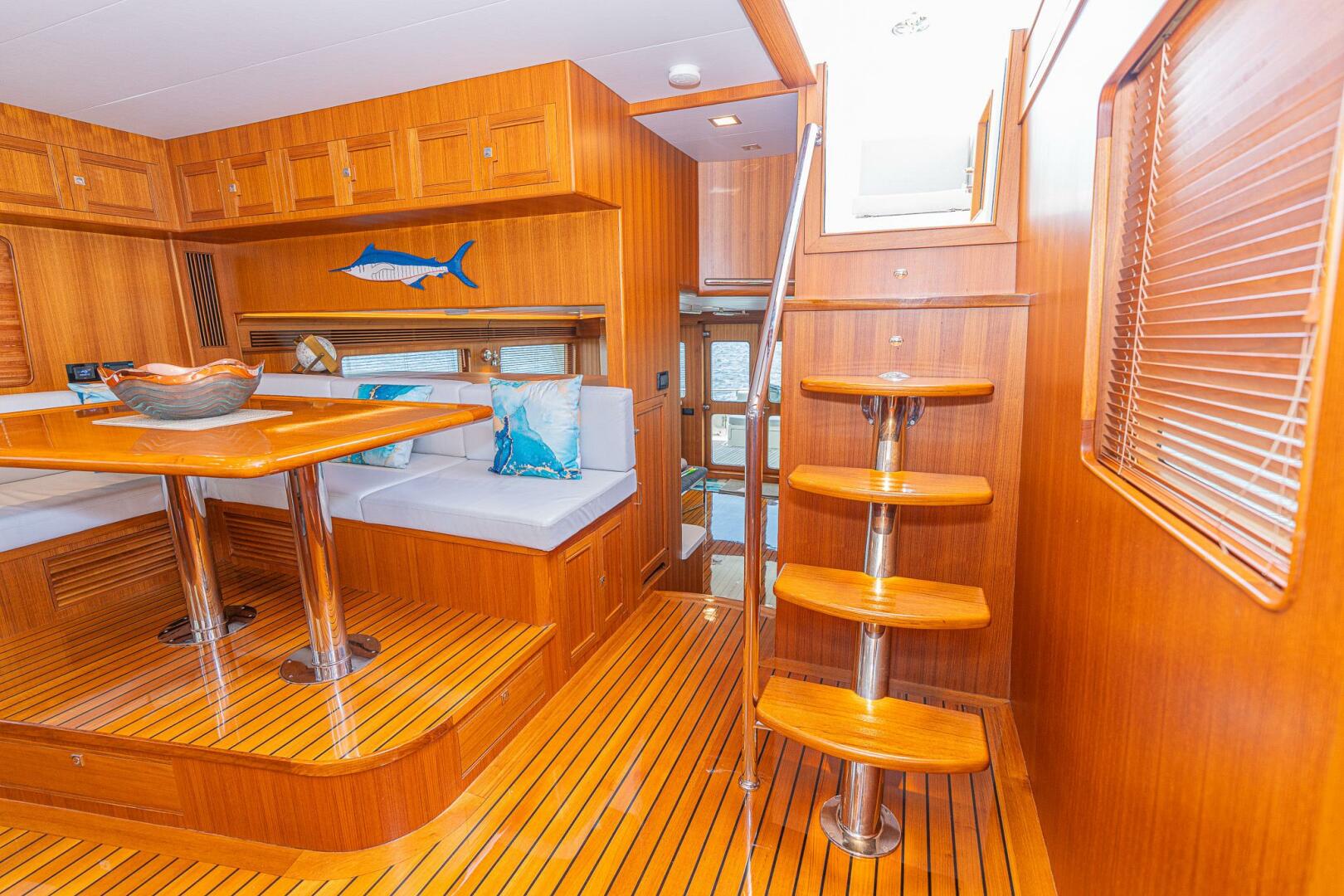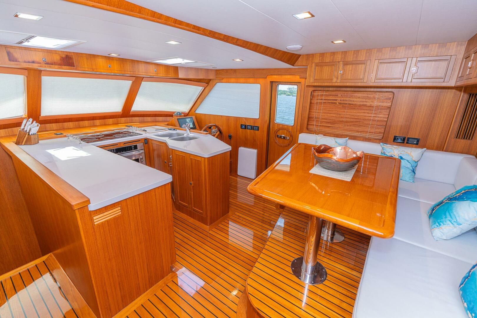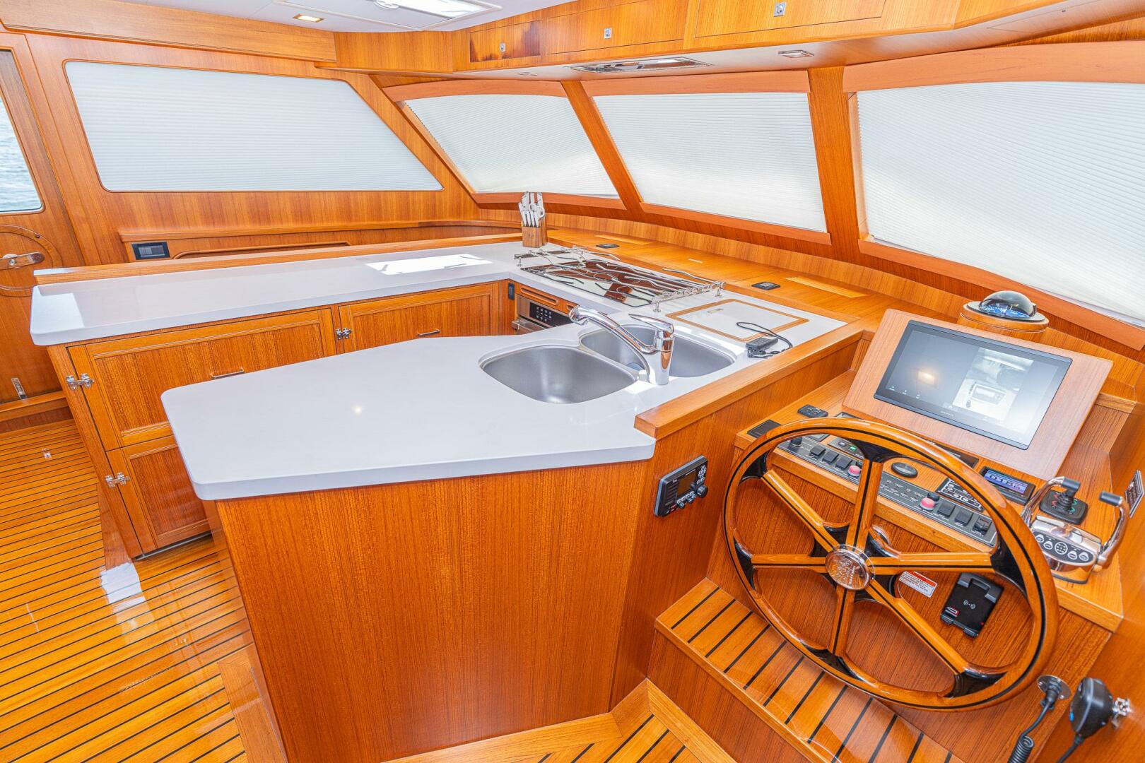 Forward of the salon in the companion way you will find neatly tucked away on port side a microwave and ice maker and on starboard side an additional beverage refrigerator and ice maker. As you proceed up the three steps you land in the forward-facing galley. The galley is well laid out and outfitted so even the most demanding of chefs will enjoy cooking in. The forward windows have Poseidon electric blinds that can provide privacy at the touch of a button. To the starboard side of the galley, you will find the lower helm. The helm provides the captain with full functionality and protection from the weather. Aft a large L shaped dining area with comfortable seating and high gloss teak table provide the setting for a dinner party overlooking the most picturesque views. 2x 30-inch Subzero refrigerator/freezer combo Dacor induction cooktop Dacor oven Sharp microwave Kitchen aid disposal at sink Large Kohler sink Poseidon electric blinds Zeus Blanco Silestone countertops Uline ice maker Uline beverage refrigerator Fusion Stereo