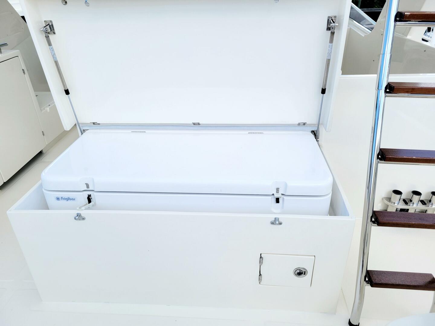 The beach club is accessed via an extra larger hydraulic door off the swim platform and also from a hatch in the cockpit area. This space is configured with two comfortable lounging berths, head with shower, hanging lockers and drawers and ample storage for the abundance of spare parts that convey. Samsung 24" LED TV Refrigerator High gloss Teak and Ebony floors Wet Head