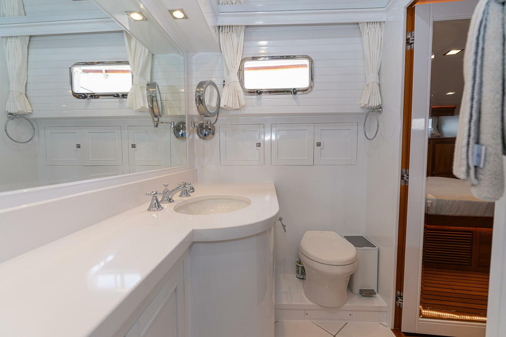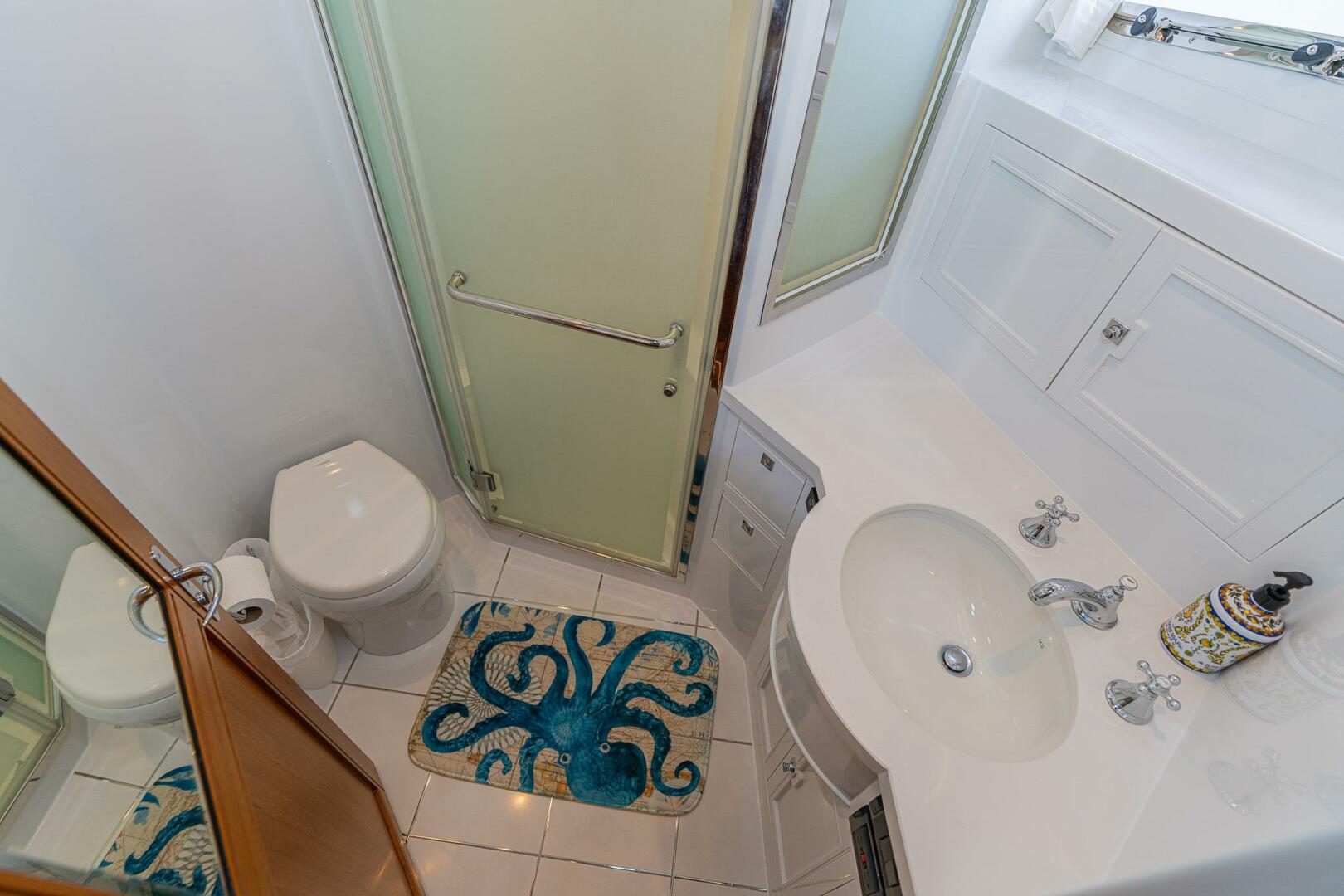 The master stateroom is full beam and provides warmth and comfort all around. The large opening port windows allow the space to be cascaded with natural light. The space is perfect for rejuvenating one's soul. The queen size bed is centerline with large drawer storage below. The port and starboard side have mirrored cabinetry with cedar lined hanging lockers and a bank of deep drawers. Aft in the master stateroom has his and hers heads. The heads are bright and airy with a luxury spa atheistic. The large Romeo and Juliet shower has Grohe rain shower and frosted glass for privacy. The Zeus Blanco Silestone floors are accented by the stainless steel “grout lines” that adds a pop of bling to the head. Additional storage is located in drawers beneath the bed and in the deck below. Zeus Blanco Silestone nightstand counter tops High Gloss Teak and Ebony floors Grohe shower head Grohe chrome faucet Dometic 8700 series heads Samsung 32" LED TV Zeus Blanco Silestone floor in head with stainless steel grout Garmin G20 Display Fusion Stereo Upgrade Upholstered headboard Glacier Ice Ultra leather upper wall with Teak lower wall