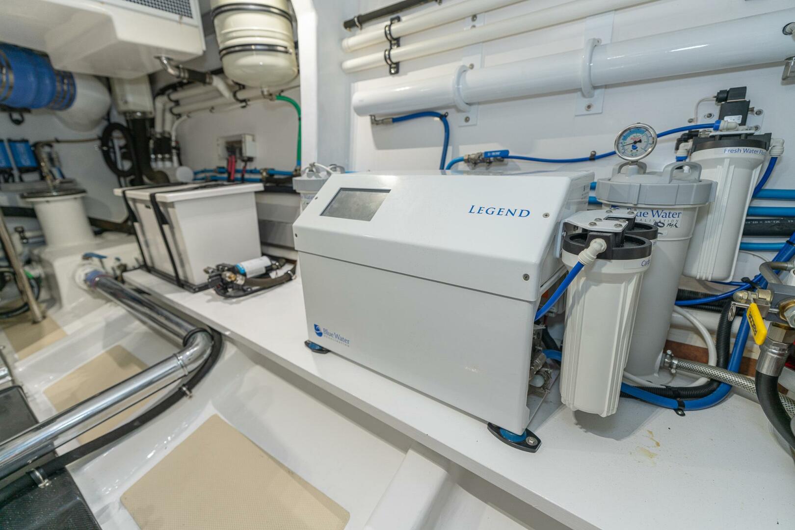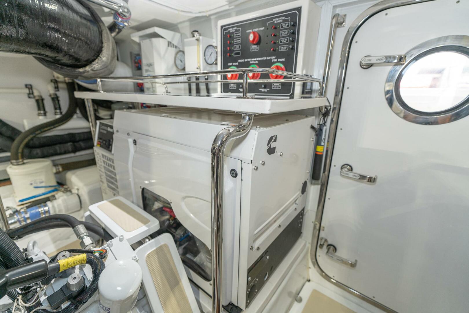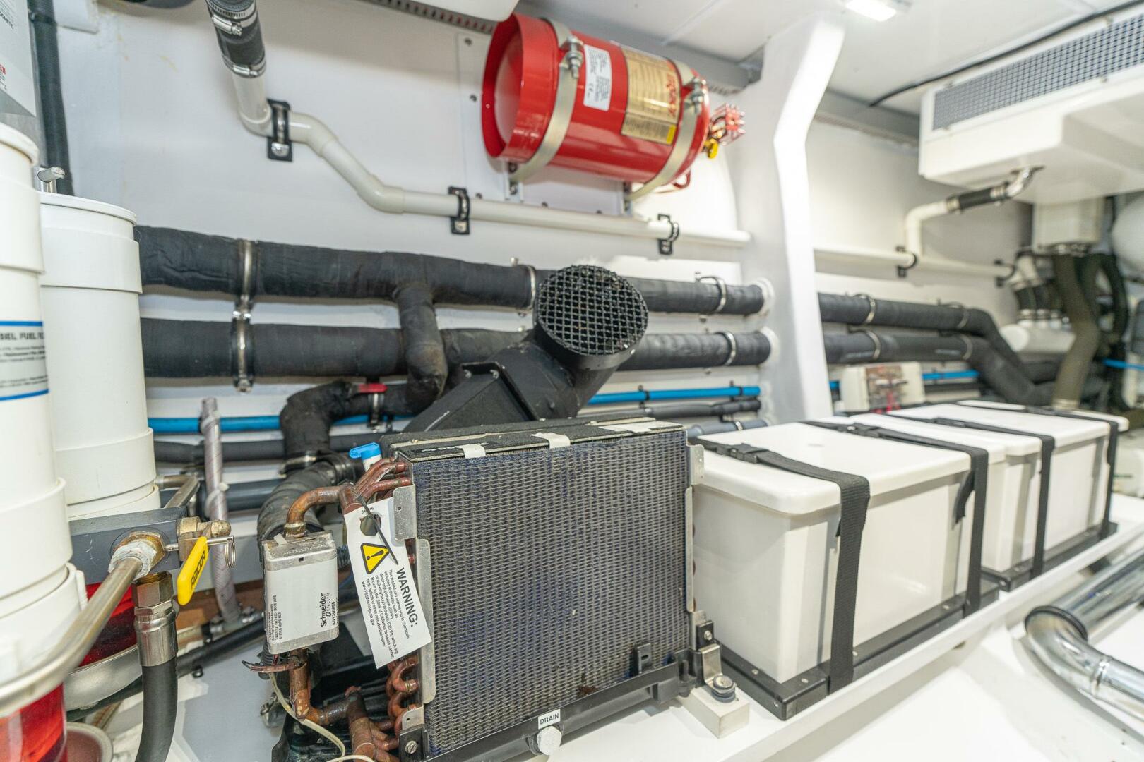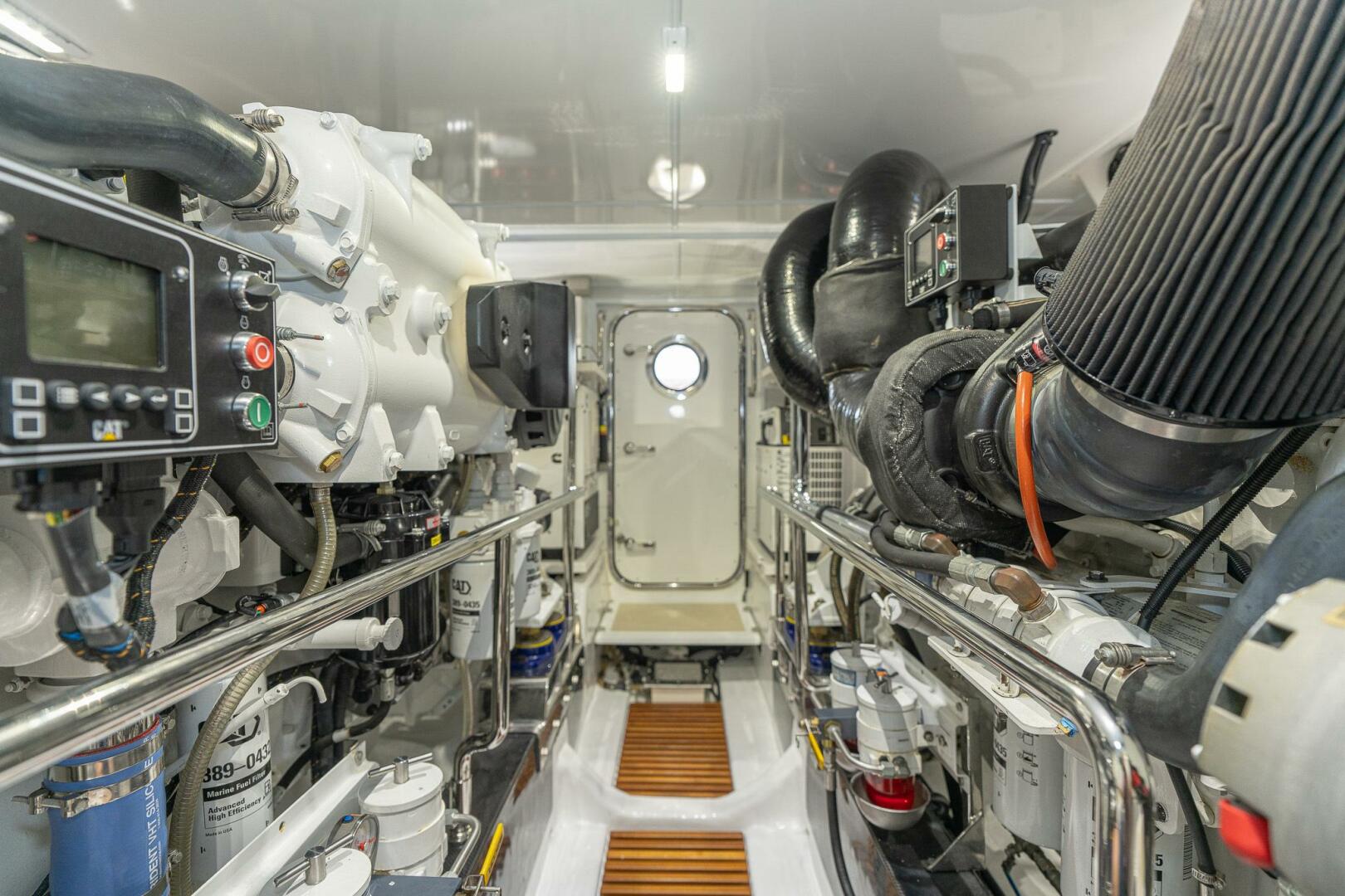 The engine room on “PARAIBA” is like a jewelry box filled with shiny gems. The center piece of the room are the twin C18 1150HP Caterpillar engines riding on carbon fiber stringers. With over 6 feet in headroom and full walk around capability checking all major components, pumps and filter an easy task. The Sea chest are in the aft outboard corners. The sea chest is a centralized system for distributing raw water to the engines, generators, and AC chillers. The 21kw Twin Onan Generators are aft of the engines. The single fuel tank is forward of the engines with a glass sight tube in the center for accurate readings. When it comes to the engine room every piece is laid out with the precision of a symphonic masterpiece. Twin Caterpillar C18 1150hp Engines (316 hours) 12 month service recently completed Twin 21kW Onan generators in custom sound shields 12 month service recently completed 950 GPD Sea Recovery Water maker Outback inverter and charger Centaur 24V 60AMP Charger Centaur 12V 40AMP Charger Two Charles Hubbell lSO Systems Lewmar Bow Thruster Lewmar Stern Thruster Soft Motor Mounts Two Cross-Connected Sea Chest Sea Water Intakes with cleanouts FRP Fuel Tank (1500 gallons) with sump and cleanout Fuel Manifold and proprietary Sight Gauge Dual Racor fuel filters with pressure gages for each engine and generator Fire Suppressant System Engine Room Lead/Foam Sound and Heat Insulation System Color coded piping Polished Stainless-Steel Engine beds with carbon fiber stringers Fuel Manifold and proprietary Sight Gauge Gel coated bilges Oil change system LED Engine Room Lighting Underwater Exhaust AGM Batteries Air-Conditioned Engine Room and Beach Club Naiad Stabilizers Twin A/C pumps Twin Fresh Water Pumps