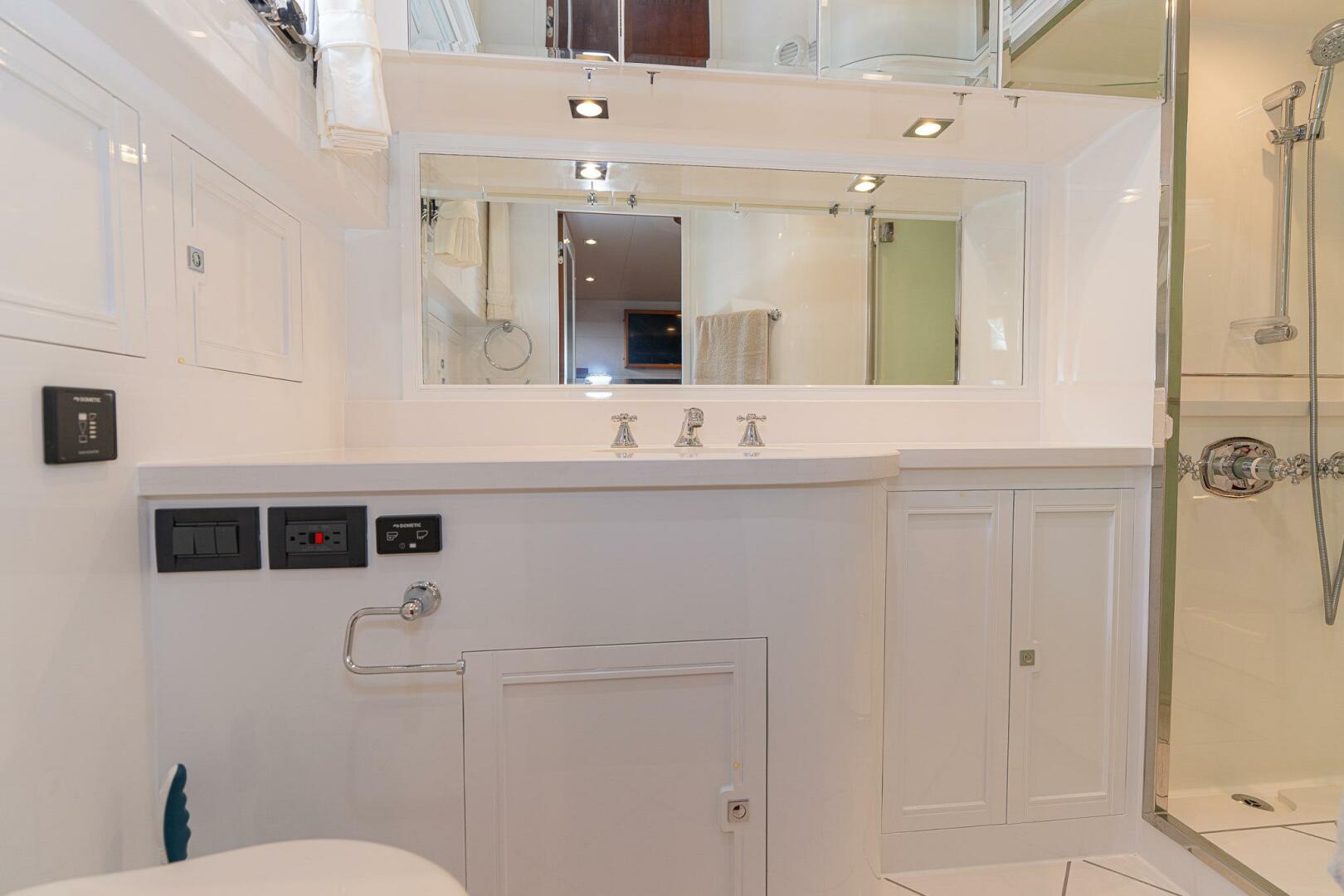 The VIP is spacious and welcoming for your guests. A large, elevated bed sits centerline with drawer storage underneath. Additional berths are on the outboard sides forward of cedar lined hanging lockers on port and starboard side. This room has direct access to the VIP head which also serves as a day head by providing access through a door on the companionway High gloss Teak and Ebony floors Cedar lined hanging lockers Zeus Blanco Silestone night stands Grohe head shower Grohe chrome faucet Dometic 8700 series head Samsung 28" TV Zeus Blanco Silestone on head countertop and floors Fusion Stereo Glacier Ice Ultra leather upper wall with Teak lower wall