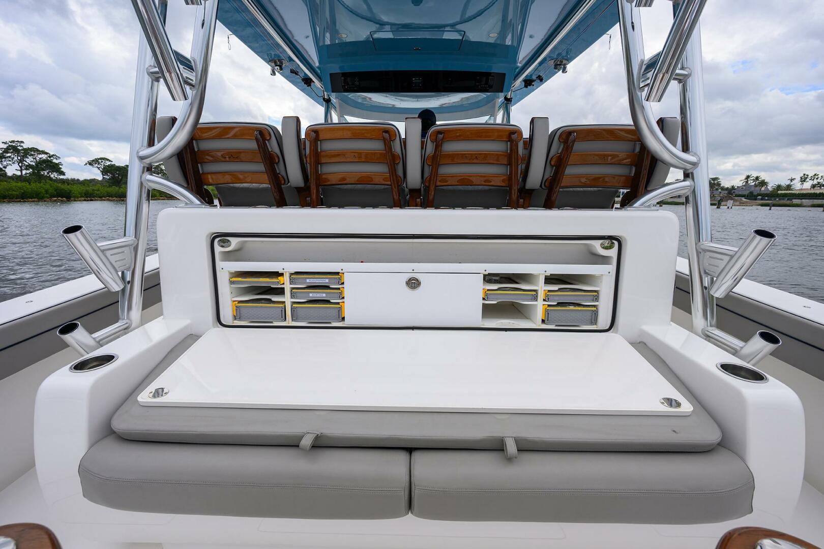 - Release marine second row seating 19" (4) with (5) armrests, and flip up holsters