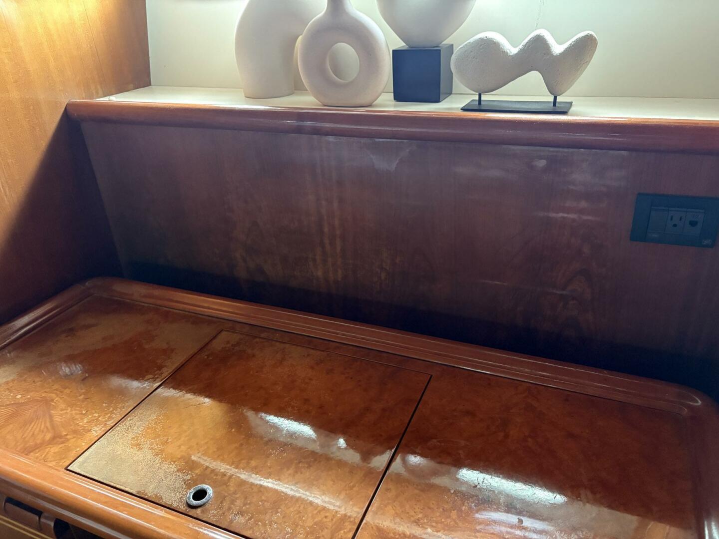 The master suite is positioned about midship below decks, high gloss Teak wood highlights the master suite. A king sized bed is located in the center with a makeup table on one side and a small couch on the other. As well as an en-suite head and shower.