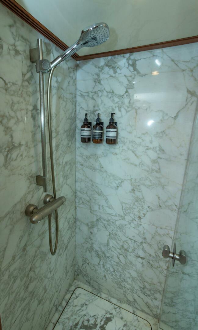 - Fresh water to 5 heads, galley, wet bar, and shower in the transom "garage".