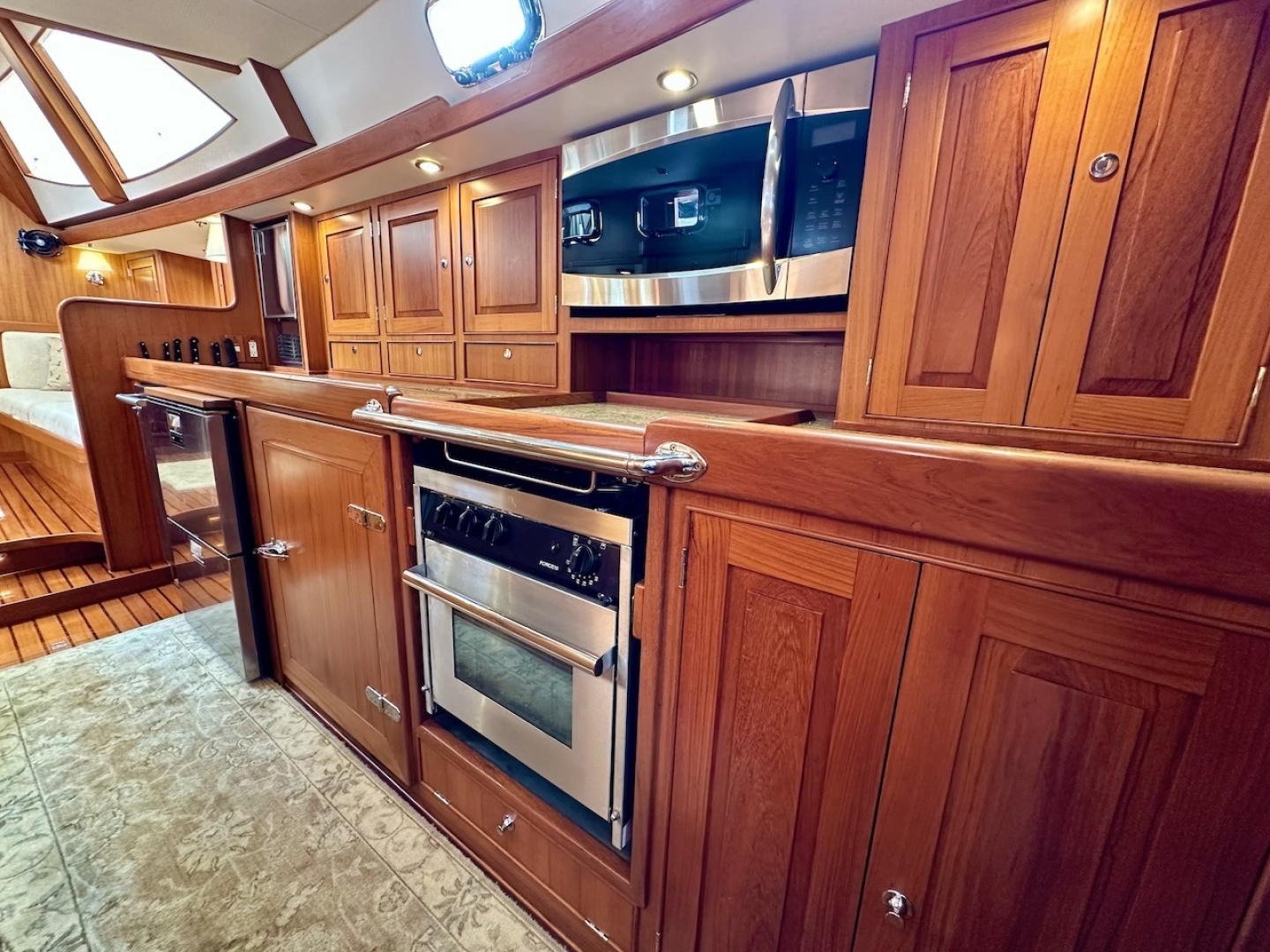 The galley aboard RELENTLESS is exceptionally well executed, blending the warmth of traditional Hylas craftsmanship with the utility and equipment level of a true long-range cruising yacht. Located to port, it is secure, highly functional underway, and thoughtfully customized for an owner who clearly valued both serious cooking capability and life aboard at a very high standard. Generous refrigeration and freezer capacity, abundant cabinetry, strong counter fiddles, excellent ventilation, and premium appliances make this a galley that is equally suited to passagemaking, entertaining, or extended liveaboard use.