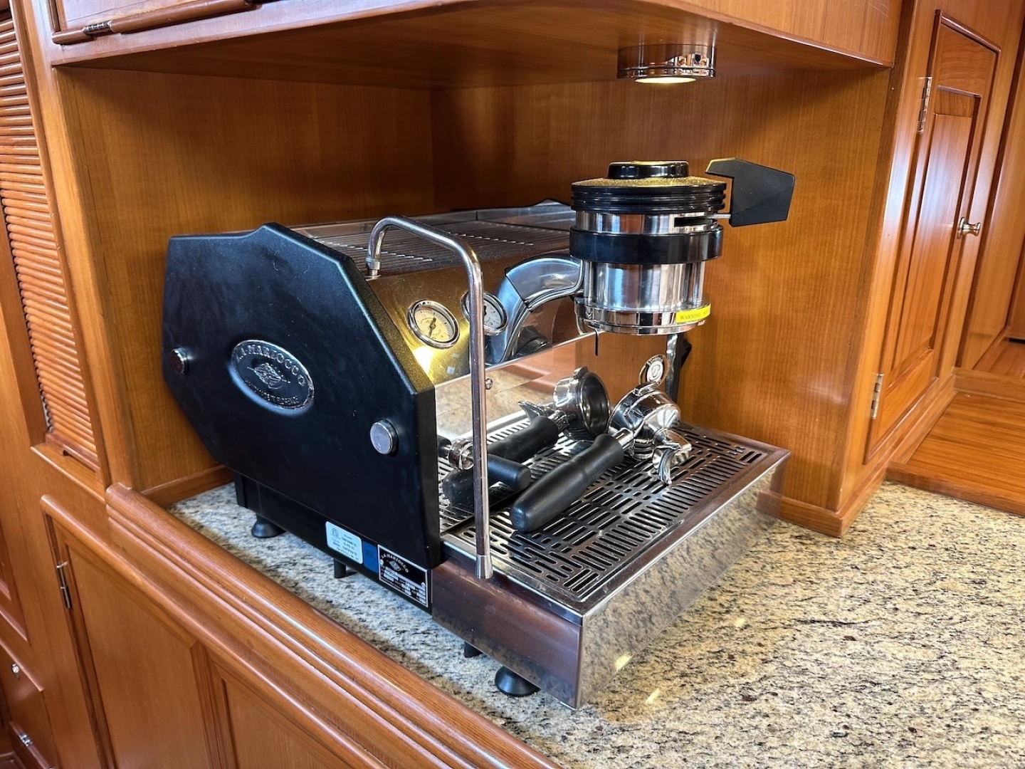 What truly sets this space apart is the level of finish and customization. Raised-panel cabinetry, owner-designed drawer arrangements, concealed stainless work surfaces, excellent task lighting, and signature Queen Long details all create a galley that feels refined without sacrificing practicality. The addition of a custom La Marzocco GS/3 espresso machine and dedicated grinder elevates the space even further, giving RELENTLESS a distinctly upscale, owner-driven character rarely found in a brokerage yacht.