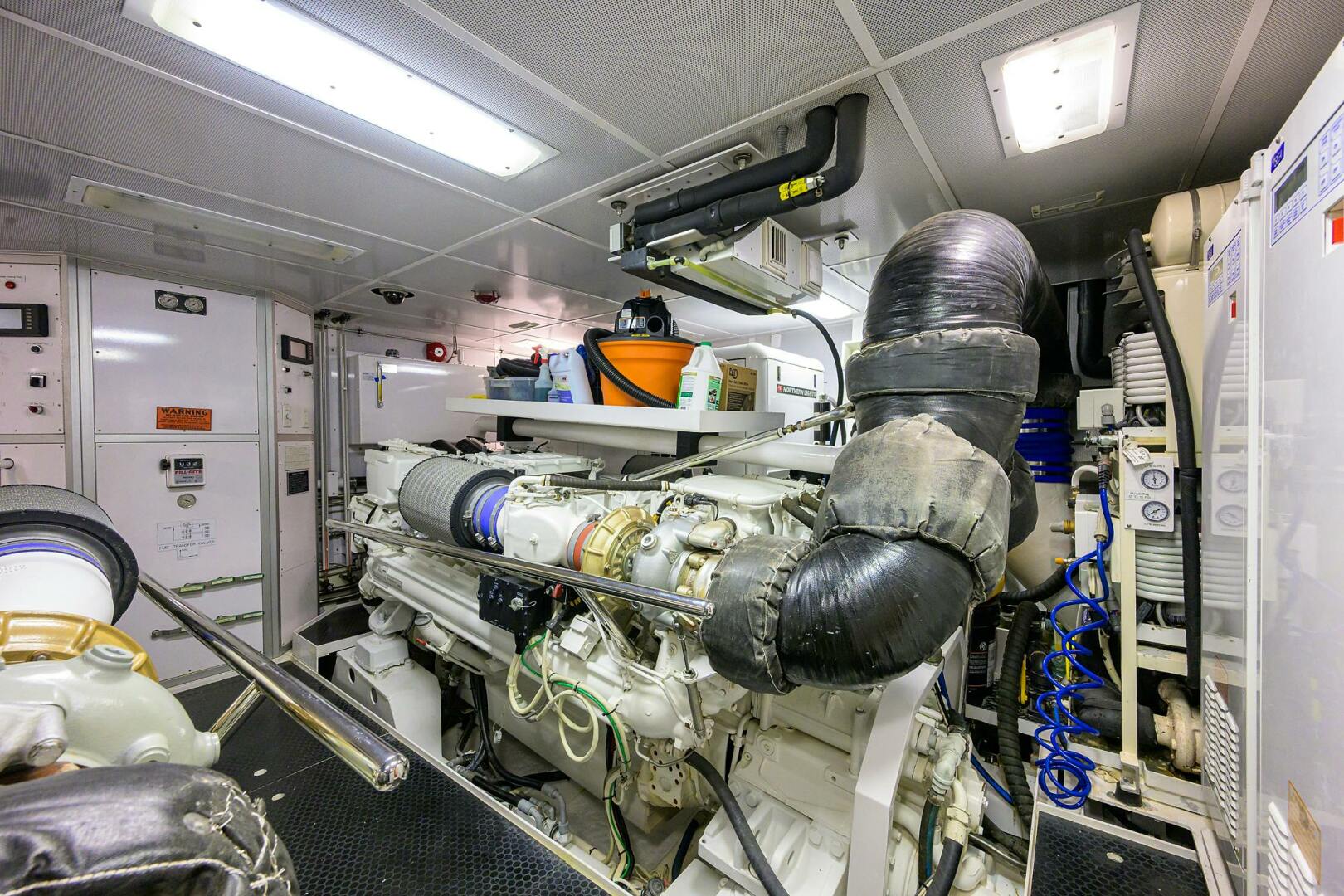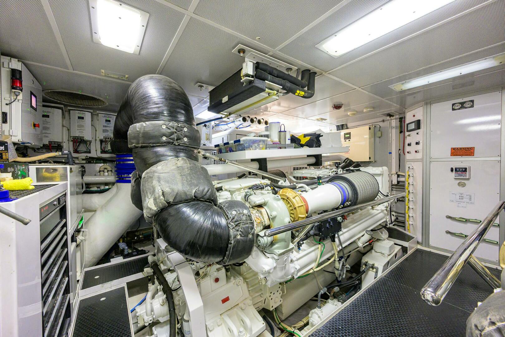 The dining area in the forward portion of the salon has a large custom dining table and 8 chairs with a Port and Starboard with custom built-in storage for China, glassware and flatware. The country kitchen Galley is forward through the starboard foyer with access to the day head and stairs up to the pilothouse. There is a large glass entrance door that is dual axis to be able dogged down for sea conditions. The GALLEY is a desired Island kitchen layout to have a very bright and airy feeling with abundant storage. A large U-shaped settee to port and forward for entertaining and casual dining with a large rectangular Skylight with sliding sunshade adds to the open feeling of the galley. All counter tops have been replaced with new lighter color marble and a new matching sink. VIP STATEROOM is forward and down a few steps with a centerline walkaround queen berth and an ensuite head. The VIP has custom sidelights that enlarge the stateroom as well. All guest staterooms feature ensuite heads with a large lighted mirror vanity, storage cabinets, upgraded faucets, Headhunter toilets, and upgraded stone accents to both the counters and shower. Master and Guest accommodations are accessed from the port side of the main salon, thru a foyer. The Foyer features a large entrance door with companion picture window, a large closet with the laundry washer and dryer stack unit for the owner and guest staterooms, additional freezer drawer storage and access underneath the Pilothouse where various ship’s electrical, equipment, and audio/visual central bases are located. This entrance area has a stone sole to the staircase leading to the lower Foyer landing. There is abundant hard luggage storage underneath this staircase. MASTER and Guest Staterooms are located amid ship and accessed via a curved staircase to the lower Foyer. The Master is full beam and features a centerline king berth with gas shock assisted lift and abundant storage underneath Mahogany wood accents, overhead wood detailing and trays, and carpeted sole. The Master has a LED TV, enlarged portlights, abundant chest drawers, a companion seat, walk-in closet, and blinds, lighting, and audio/visual entertainment control are all accessed via the Crestron I-Pad tablet. The Master Stateroom has entrances port and starboard, to the his & hers full beam head. This head has dual vanities with overhead lighting, upgraded faucets on the vanities, storage cabinets, upgraded dual shower heads, custom upgraded stones on the vanity tops, sole and in the centerline shower, Headhunter heads, and linen closets. Guest Staterooms are located aft of the lower foyer and feature overhead LED lighting, enlarged port lights, and carpeted soles. The port Guest Stateroom features side by side twin berths with storage underneath, a nightstand which can be relocated and the berths joined to create a single large berth, and hanging locker. The audio/visual entertainment, and lighting are operated via the Creston I-Pad tablet. The starboard Guest Stateroom features two side by side berths with a nightstand in the center that can be relocated and both berths joined to form a large, single berth. There is storage underneath each berth accessed by drawers, and a hanging locker. The audio/visual entertainment located forward. The PILOT HOUSE features the full complement in navigational electronics; a power actuated custom Stidd helm chair, navigation desk, a large oval shaped observation lounge with table,180-degree visibility through large Pilothouse windows, a pop-up LED TV, and a staircase up through a sliding stainless door to port accessing the Flybridge. Navigation equipment has been updated FLYBRIDGE has a centerline helm (3) Stidd power actuated chairs, teak sole, factory hardtop with overhead LED lighting; a large seating area to starboard with teak table, a full bar with sink, refrigeration, icemaker, grill and bar seating to port. The Boat Deck is down a few steps aft and features a large hot tub to port, a lounge to starboard, access to staircase via a protected sliding door to starboard, and ample storage for a 15’ RIB tender with davit crane. The Foredeck of REMY ROO was redesigned to feature a large sun pad with more storage underneath. Just one side stores 8 scuba tanks as well as 8 sets of dive gear. New teak decks are being installed for the lower section of the flybridge/boat deck making an attractive seating area with tender removed. The redesigned CAPTAIN AND CREW quarters and engine room are accessed from either the aft deck to starboard, or the swim platform. This area has a laundry center with washer and dryer, sink and refrigerator, cabinets, and a large icemaker and 2 freezers. The Captain's Stateroom is located to port with a queen berth, cabinets, a hanging locker, ensuite head with shower, entertainment, and desk. The 2 CREW Staterooms are to starboard, and both have double over/under bunks, the crew staterooms share an ensuite head with showers, and entertainment. The Engine Room is accessed forward of the Crew Quarters.