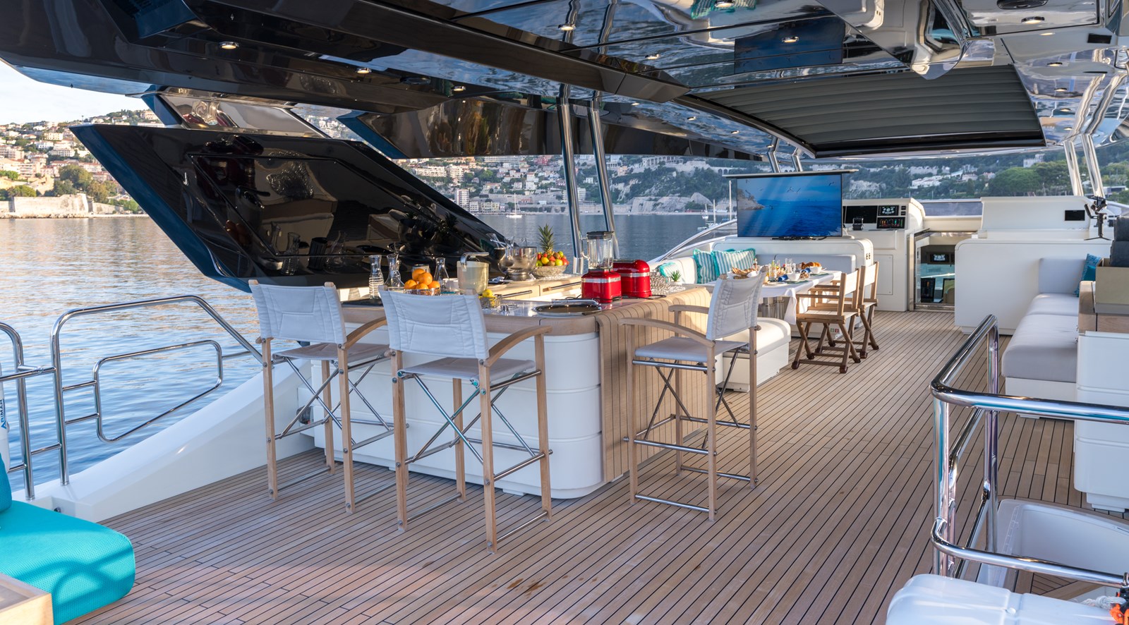 Her unique layout maximizes interior and exterior space, featuring a well-appointed bow and a spacious flybridge outfitted with a bar, table, and sunbathing area. The retractable top allows fresh air circulation and enhanced sun exposure, ideal for off-season cruising.