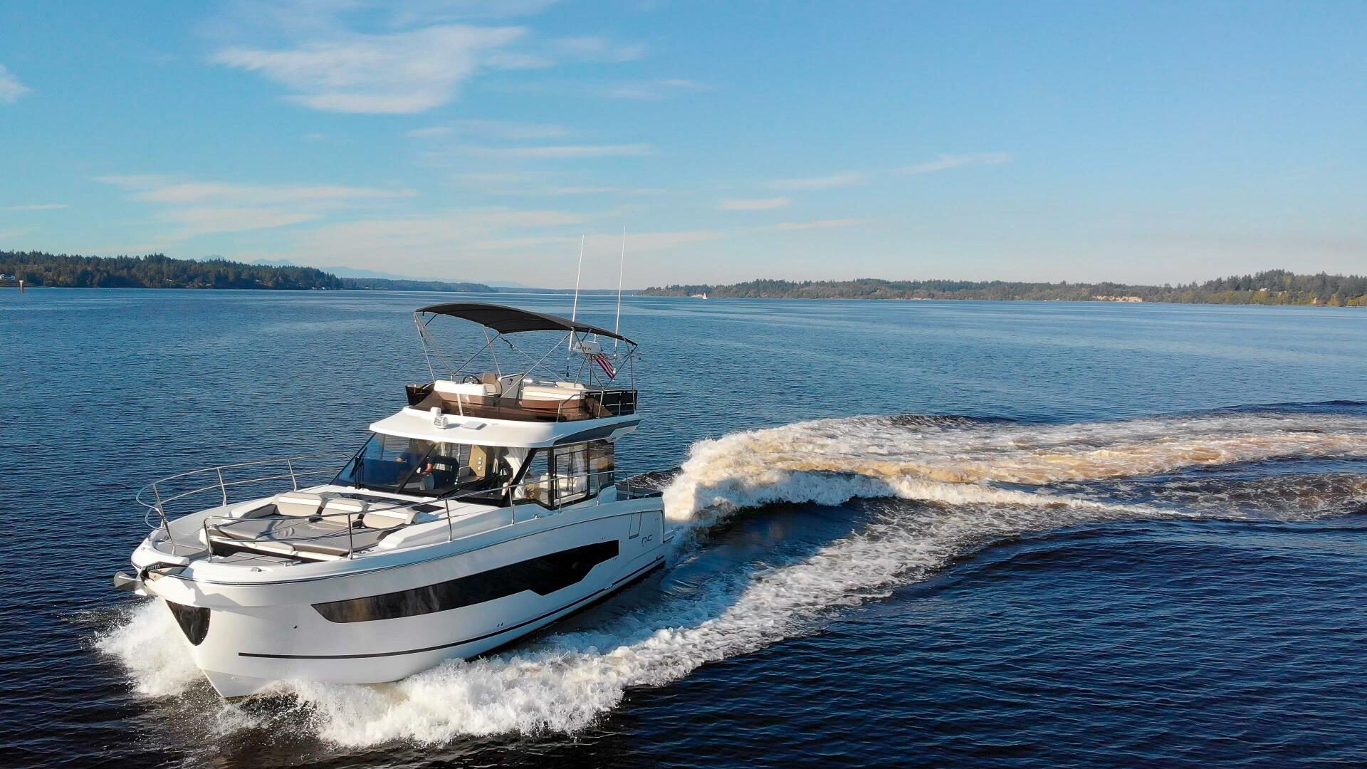The aft cockpit is designed for entertaining and easy flow. An L-shaped lounge wraps around a folding teak table, with an extendable cockpit module that slides aft to expand deck space. The electric awning deploys at the touch of a button for shade and comfort.