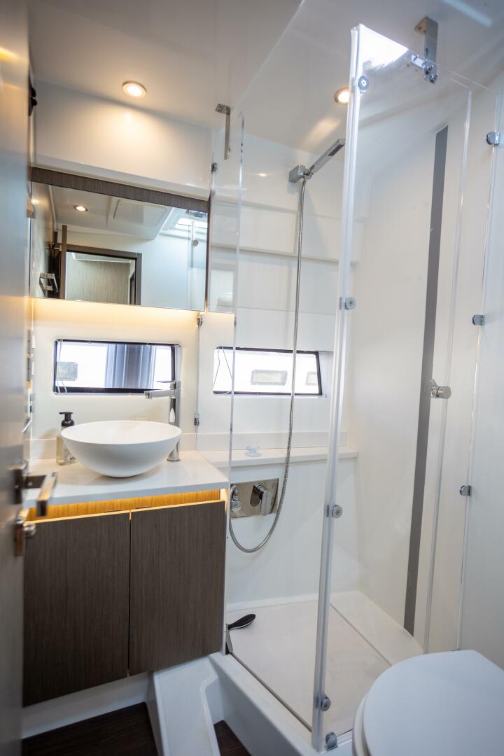 - Master Stateroom (midship): Full beam, walkaround queen berth with memory foam topper, large hull windows, skylight, hanging locker, and ensuite with separate shower.
