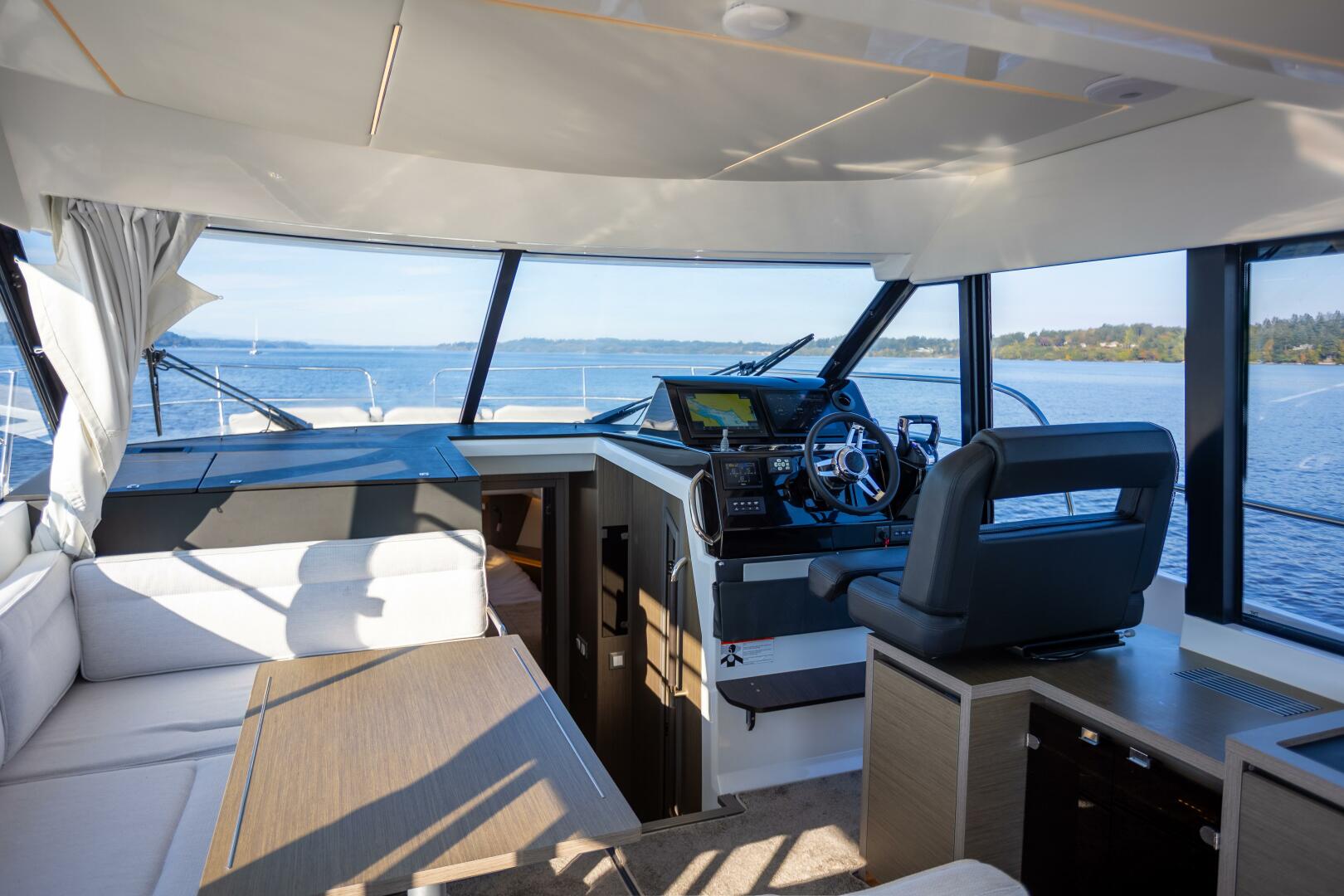 To port, a U-shaped dinette comfortably seats six and converts to a berth when needed. The helm seat rotates to face the table for social settings.