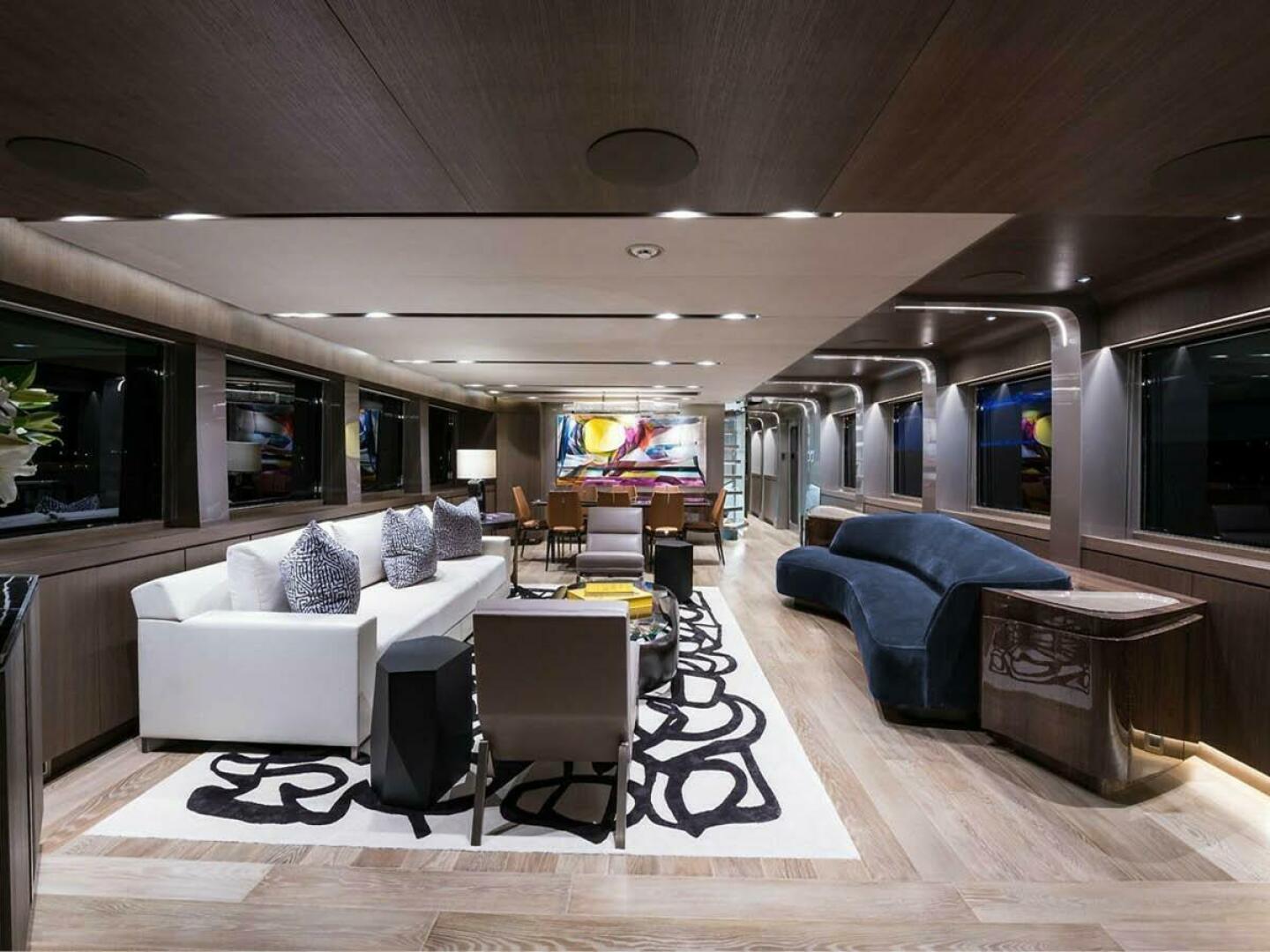 The interior of SERENITY boasts a striking contemporary aesthetic, masterfully designed by the acclaimed Holly Hunt. Each detail reflects a commitment to modern elegance and comfort, creating an inviting atmosphere throughout the yacht.