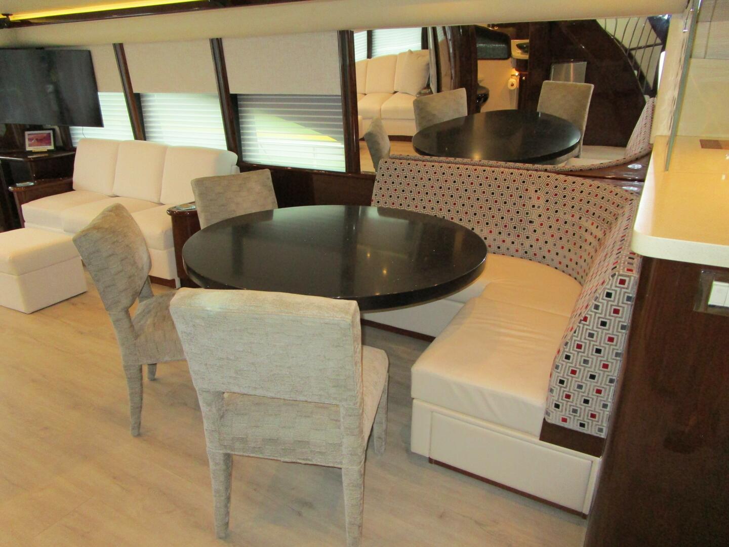 Next forward to port is a newly installed dining area replacing the walkaround bar the yacht was built with. A curved upholstered seat for three is forward, three loose chairs aft, all set around a black quartz topped round table with a stainless steel pedestal. An attractive round nine LED light fixture is above the table. Two huge storage drawers slide out of the built in seating allows for access without pulling up the cushion.