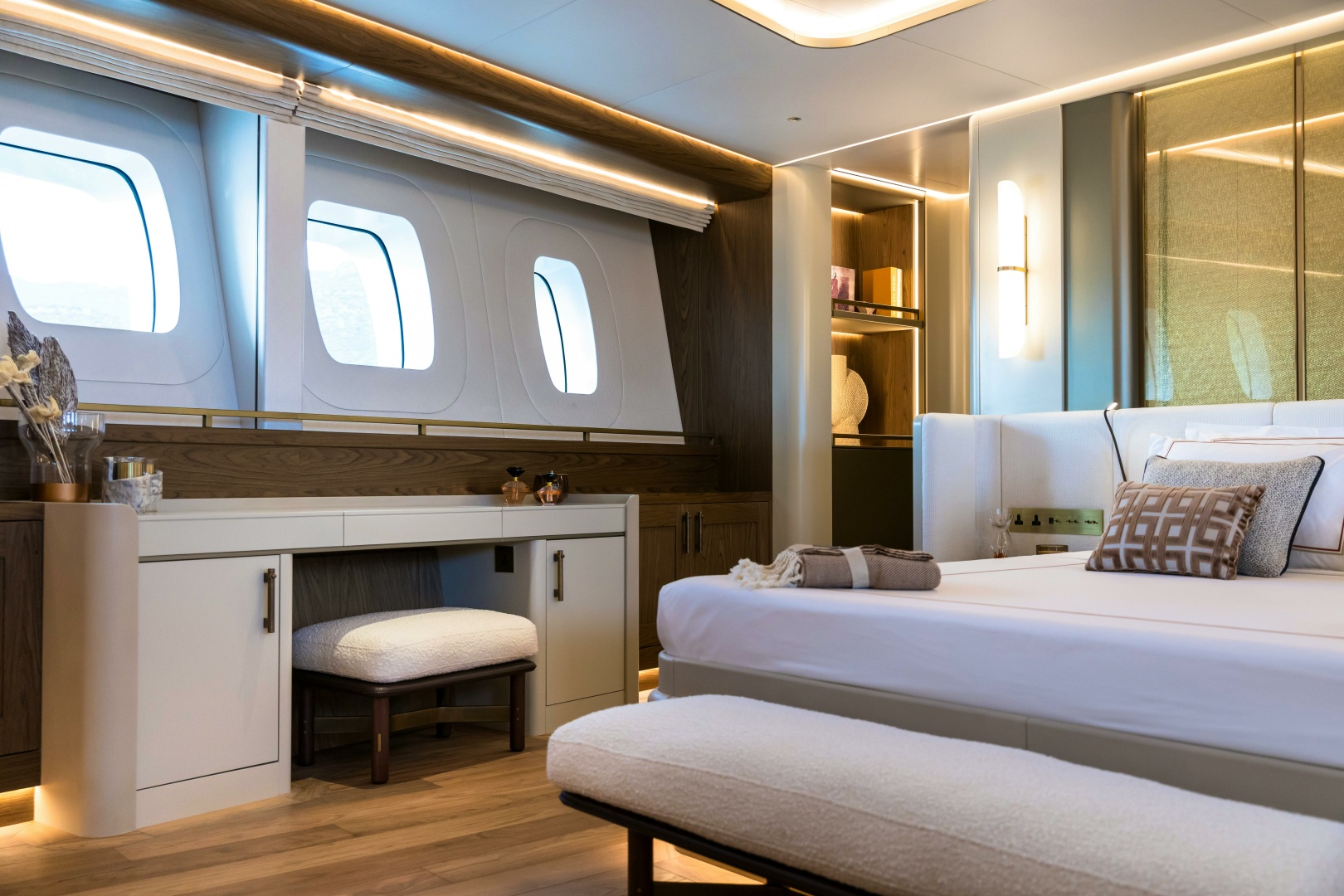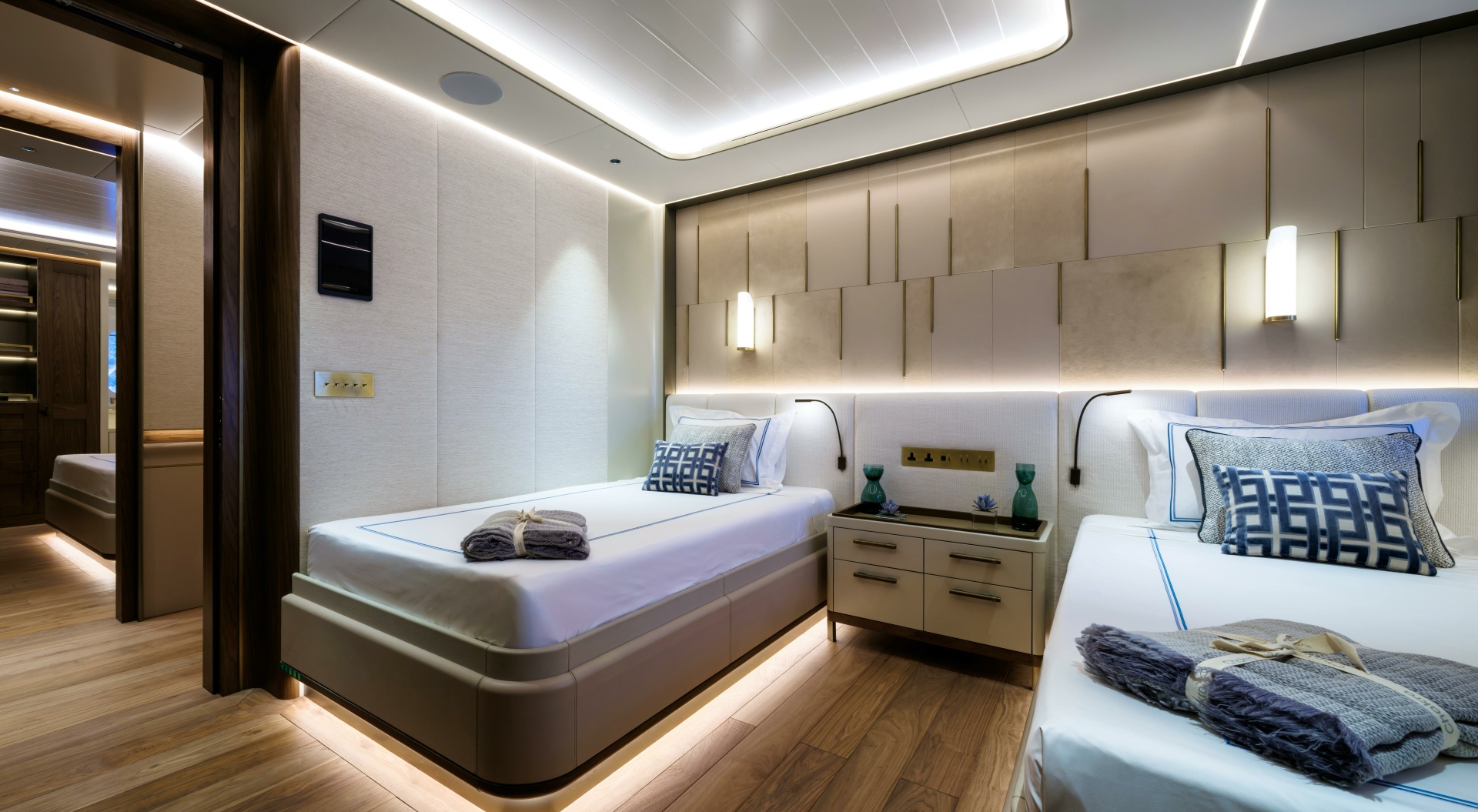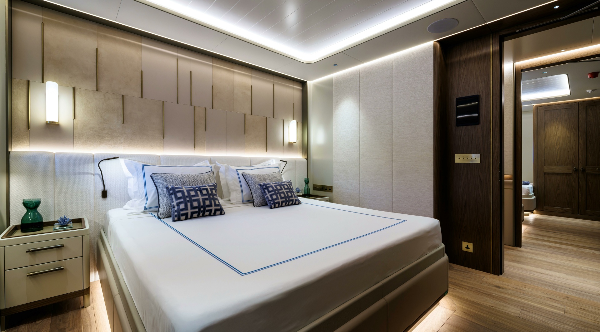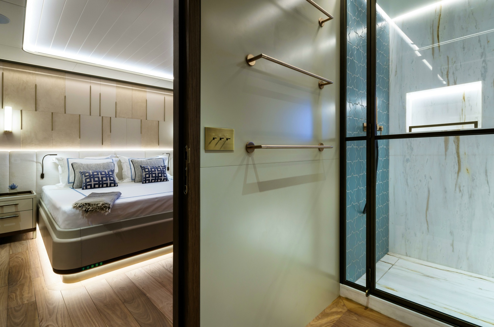 Carefully illuminated fine woven metals encased in glass create semi-transparent divisions behind the king-size bed, while textural woven leather panels framed within the furniture construction add subtle yet distinctive feature elements within the cabin.