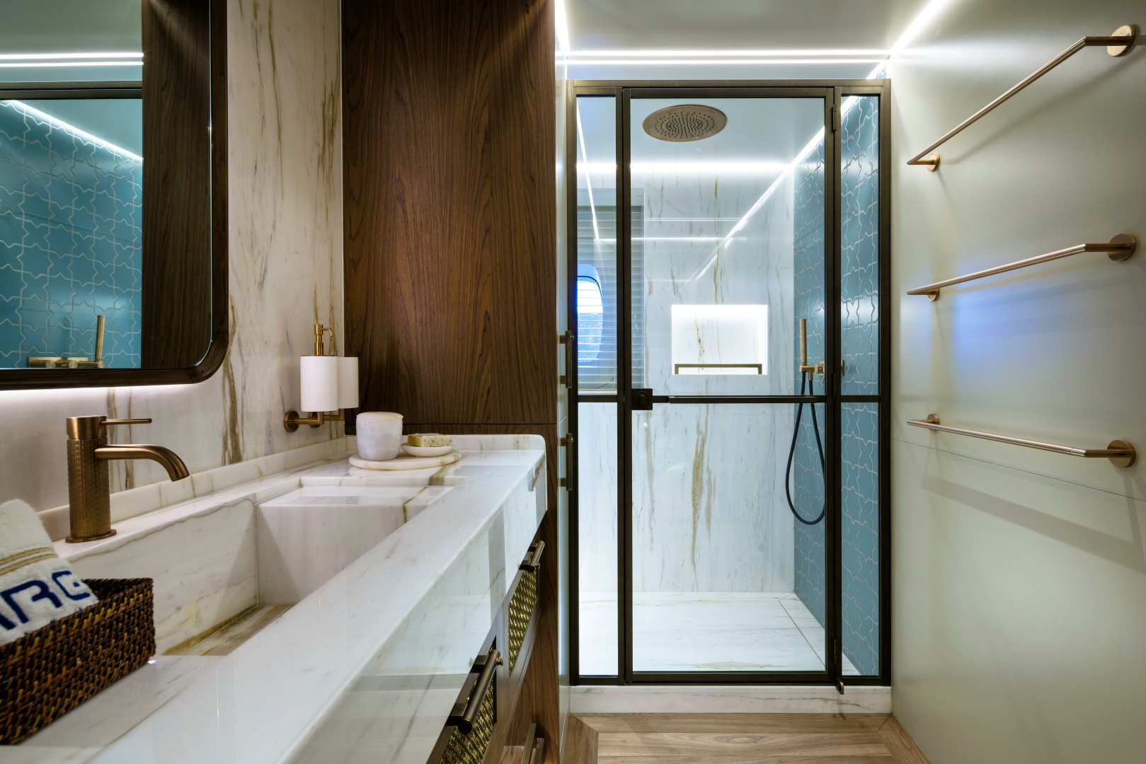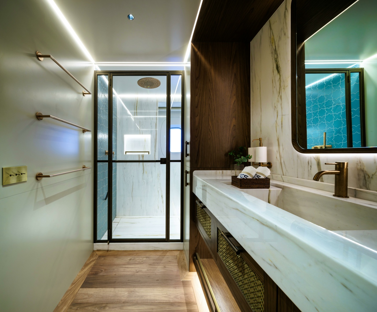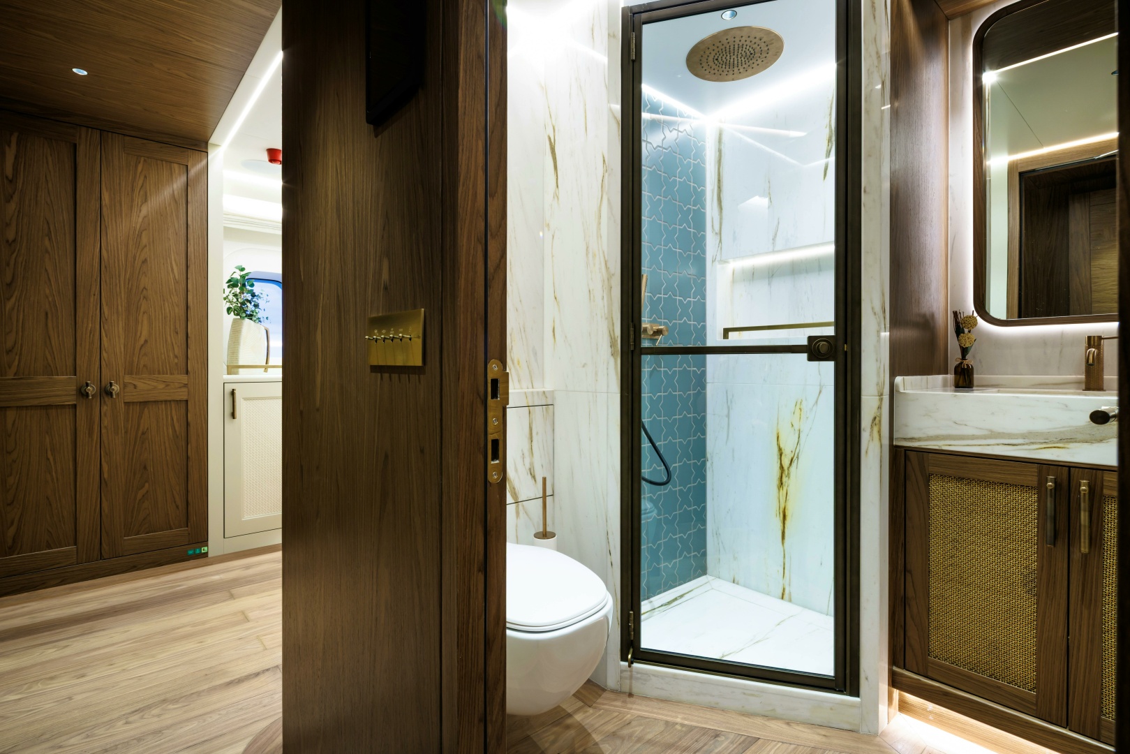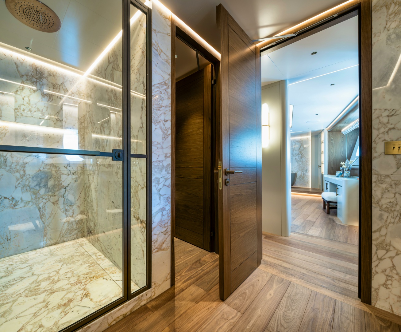 Carefully illuminated fine woven metals encased in glass create semi-transparent divisions behind the king-size bed, while textural woven leather panels framed within the furniture construction add subtle yet distinctive feature elements within the cabin.