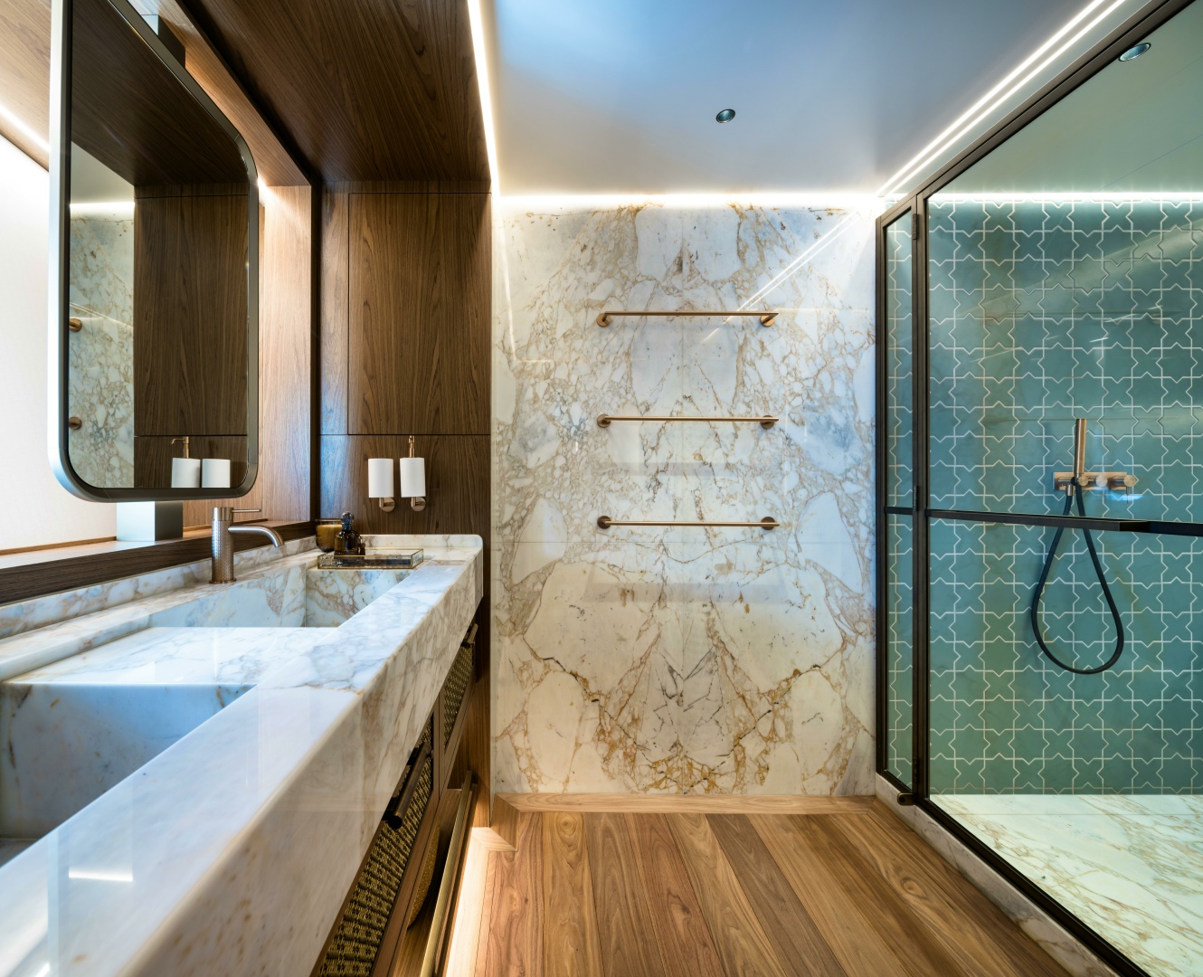 Showers are a combination of patterned tiles alongside Calacatta Oro and Patagonia White marbles.