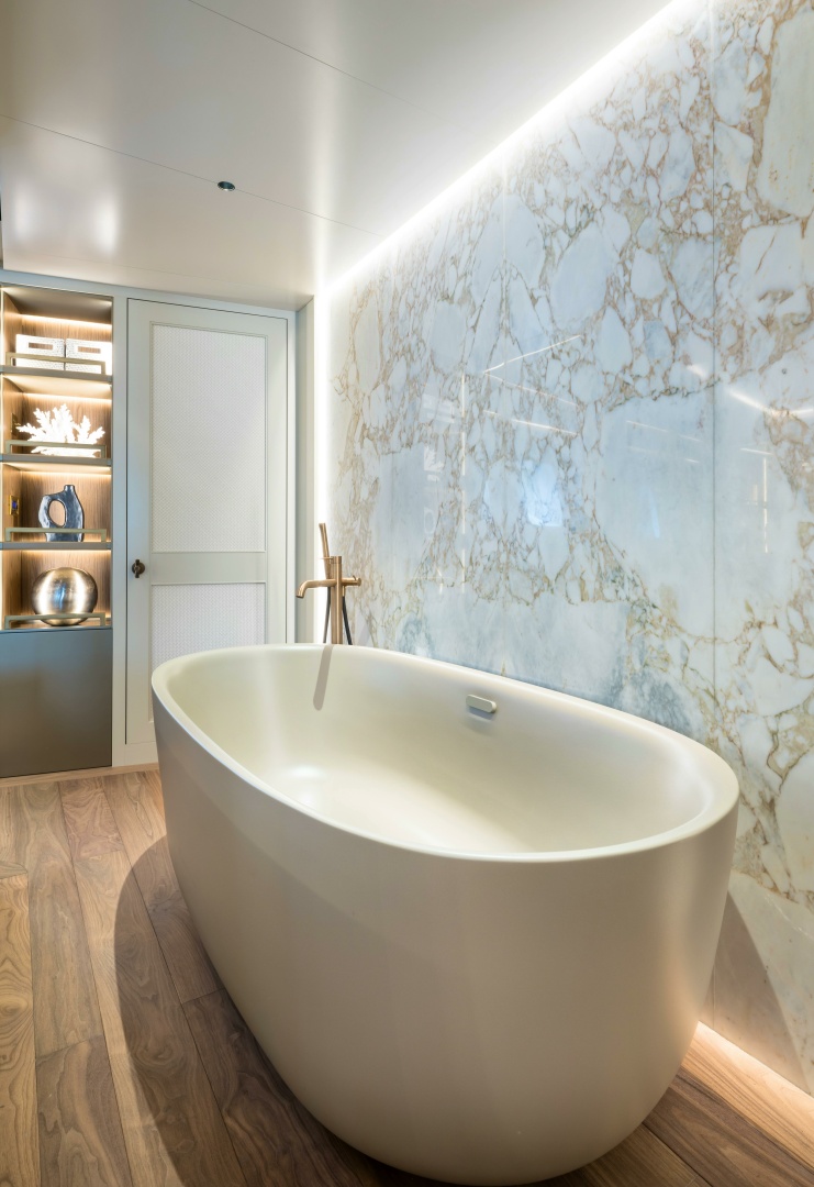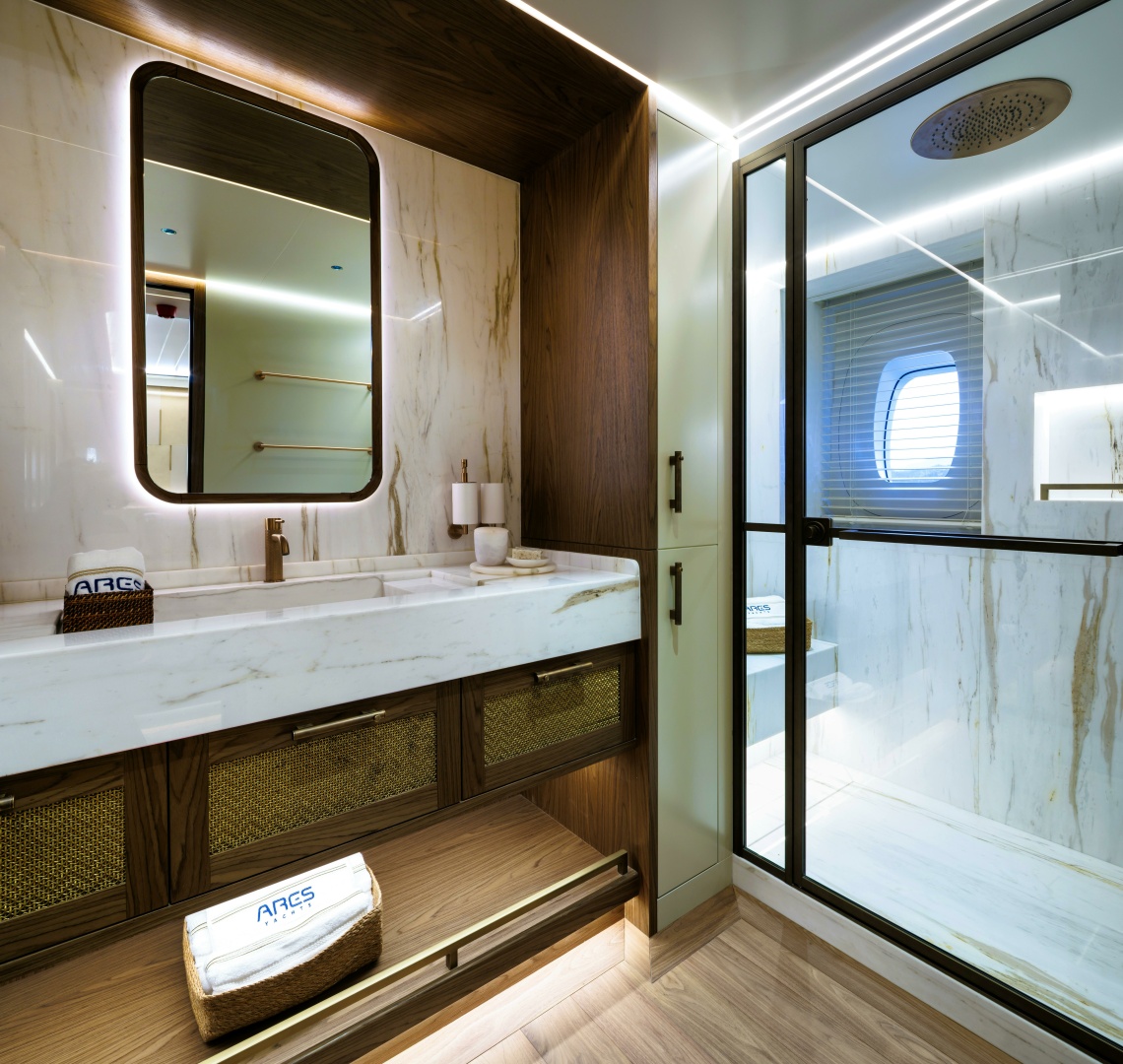 Ower's Suite: The full-beam owner’s suite, positioned forward on the main deck, boasts luxurious amenities for unparalleled comfort. Enjoy a walk-around berth, a private hot tub framed by marble, a spacious en-suite, and a dressing room.