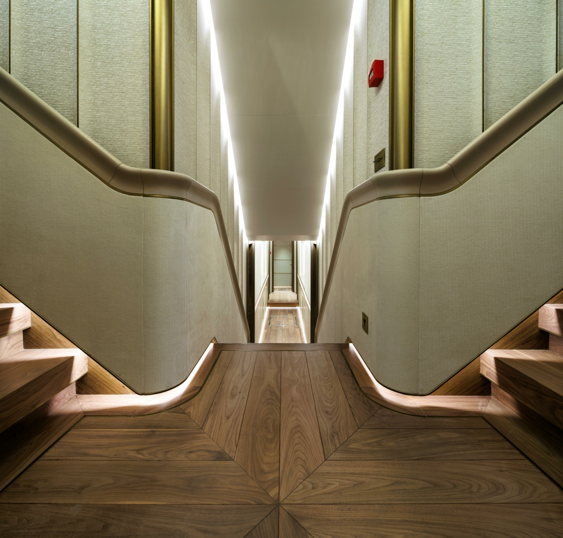 The layout creates an elegant design to highlight the flow of the staircase in its different directions using considered geometry and finishes to complement the space.
