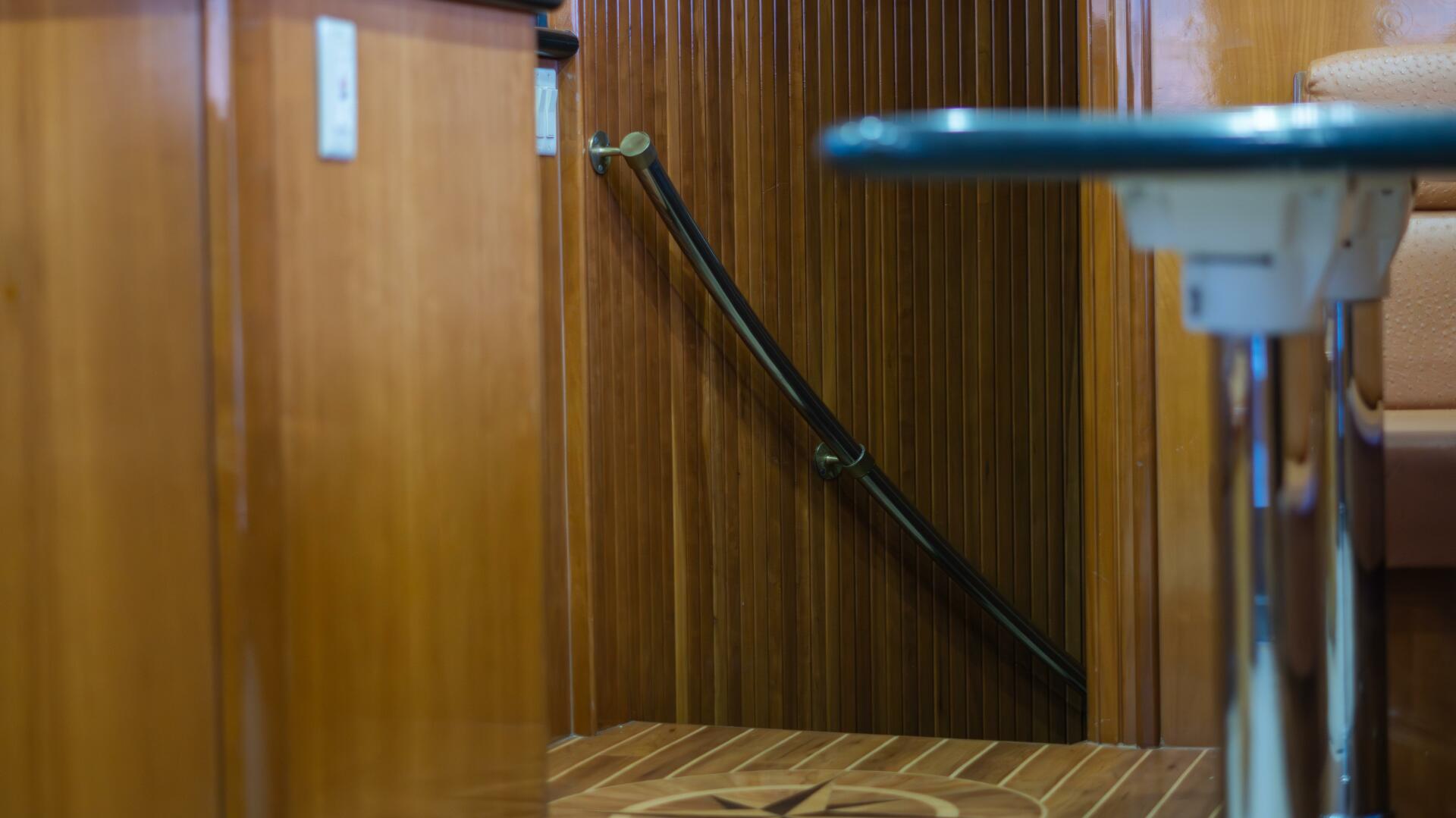 Cherry interior wood with large windows. Air flows through fluted soffits allowing cool air to disperse throughout the salon. To port, a L-shaped sofa with storage underneath with table providing storage. To starboard a flat screen TV and dinette that seats 4.