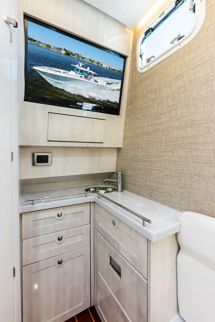 - Summer Kitchen - Corian Counter Top, Sink, Storage, and 12 volt S/S Refrigerator, Garmin - Aft Facing Screen, 16", Mounted Above Summer Kitchen