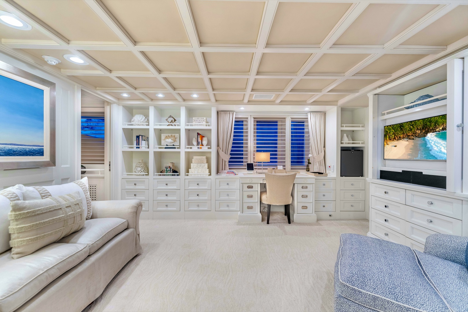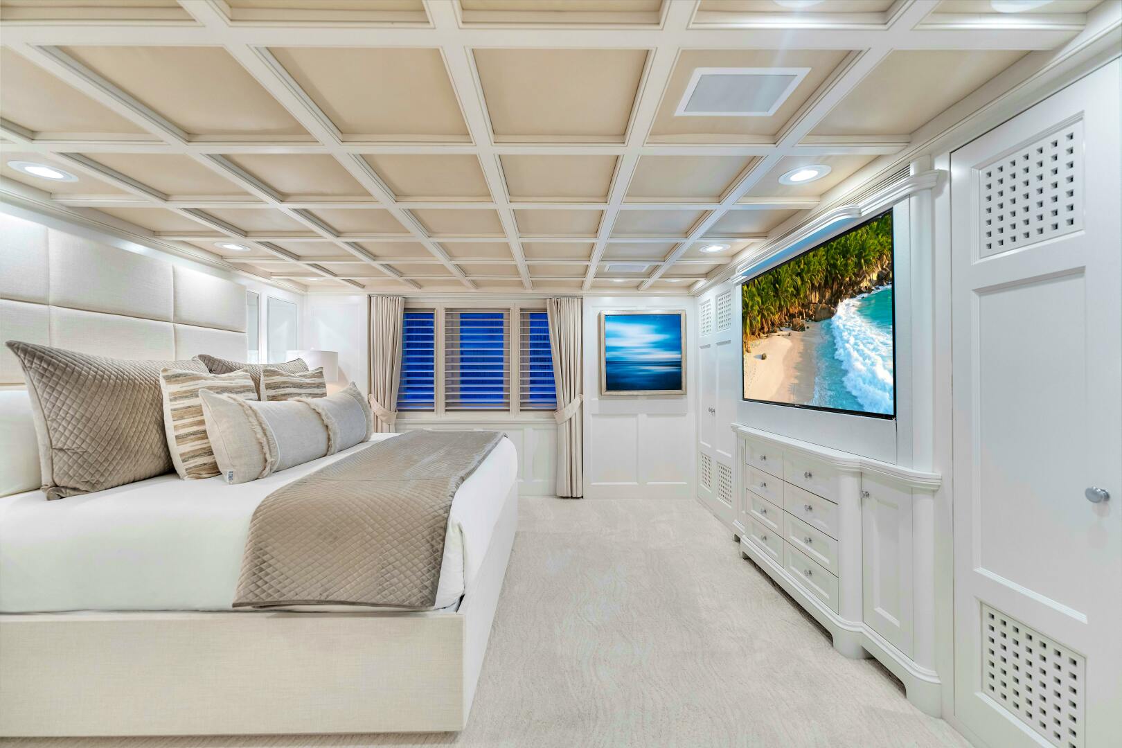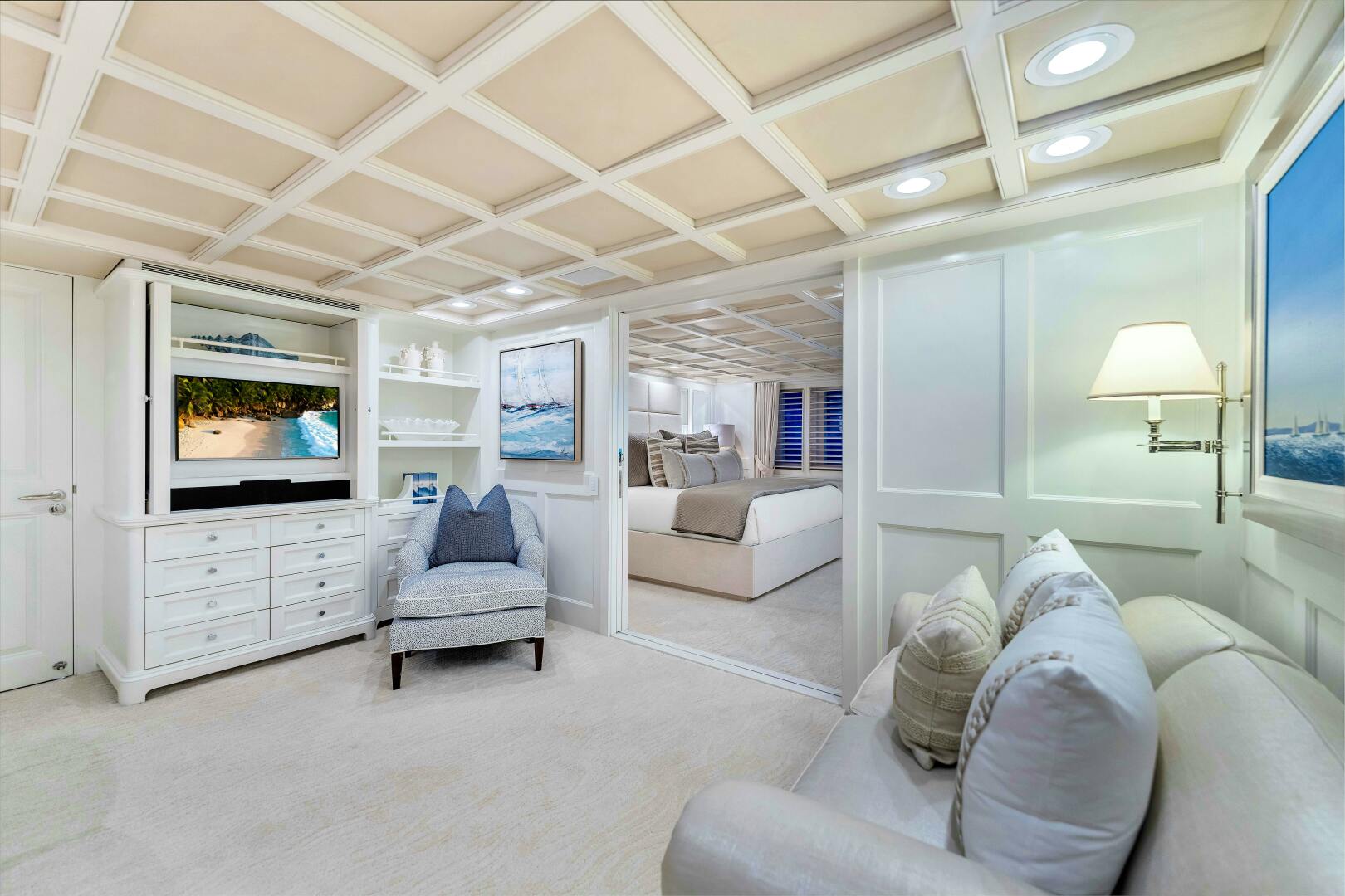 Proceeding forward, the entrance to the master stateroom is via a starboard side passageway. The full-beam master stateroom offers a luxurious retreat, with a custom king-size bed centrally located in the port-side sleeping area, facing forward toward an entertainment center. A semi-bulkhead with a sliding door separates the owner's sitting lounge from the sleeping area. The lounge is furnished with easy chairs, a two-person settee, bookshelves, an entertainment center, and a desk on the outboard side, creating a relaxing space.