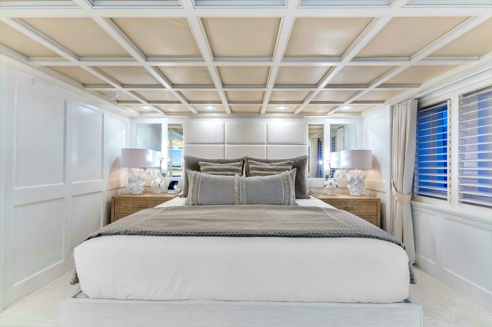 STAR DIAMOND accommodates 10 guests in ultimate comfort across five luxuriously appointed staterooms. The full-beam master stateroom on the main deck offers unparalleled privacy. The owner’s lounge, located on the starboard side, includes seating, an entertainment center, and a desk. The sleeping area on the port side features a plush king-size bed, and the master suite is completed with a luxurious en-suite bath, featuring both a shower and a Jacuzzi tub. The additional guest staterooms provide versatility, with two double-bed staterooms and two convertible twin beds, ensuring ample space for all.