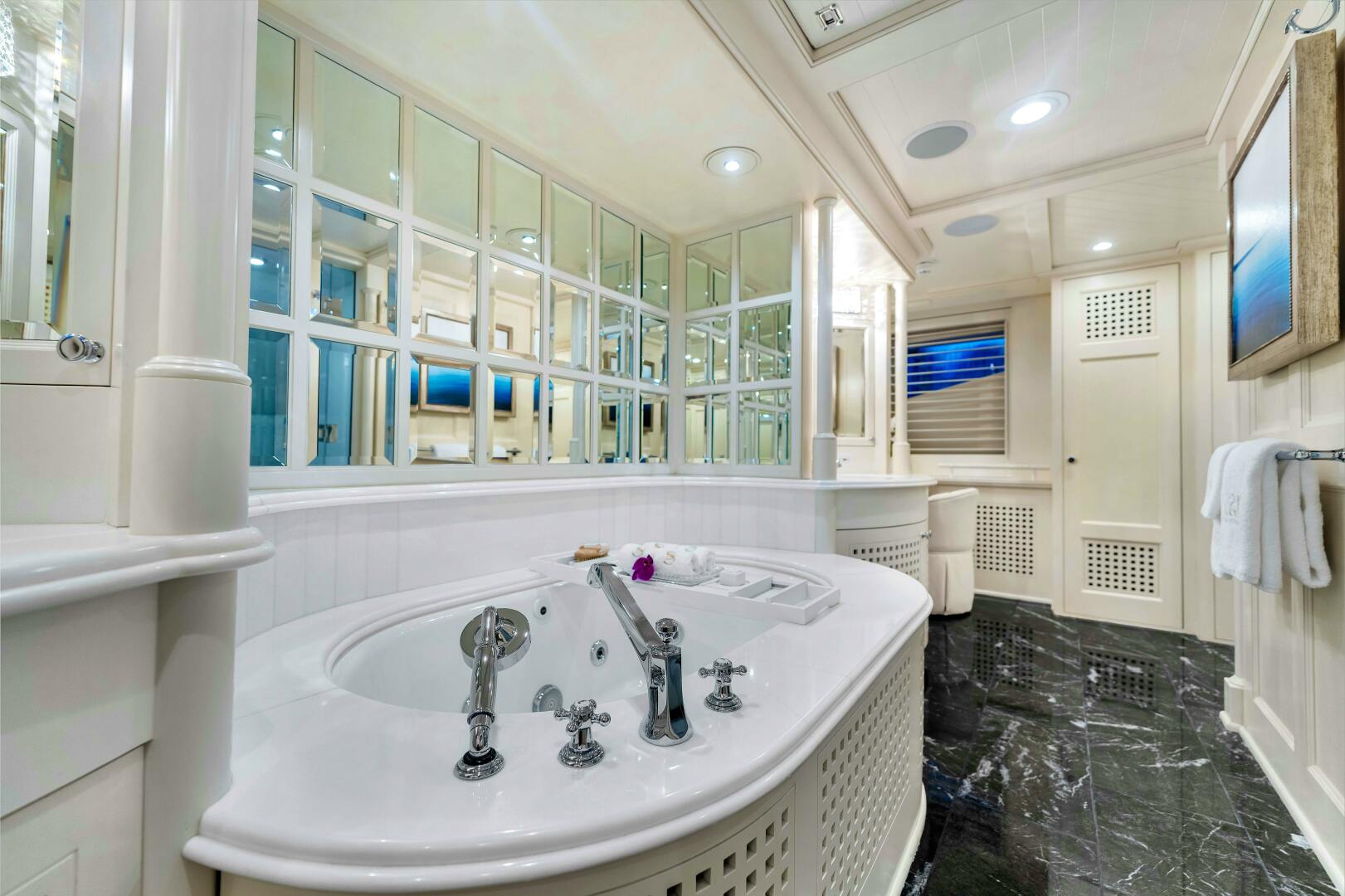The aft port guest stateroom is configured with two twin beds that, when stored, allow the stateroom to transform into a sitting room or the suite side of a full-beam guest suite when combined with the aft starboard queen stateroom. This port-side "suite" includes a marble bathroom with a bathtub and shower, and the twin beds can be converted into a king bed.