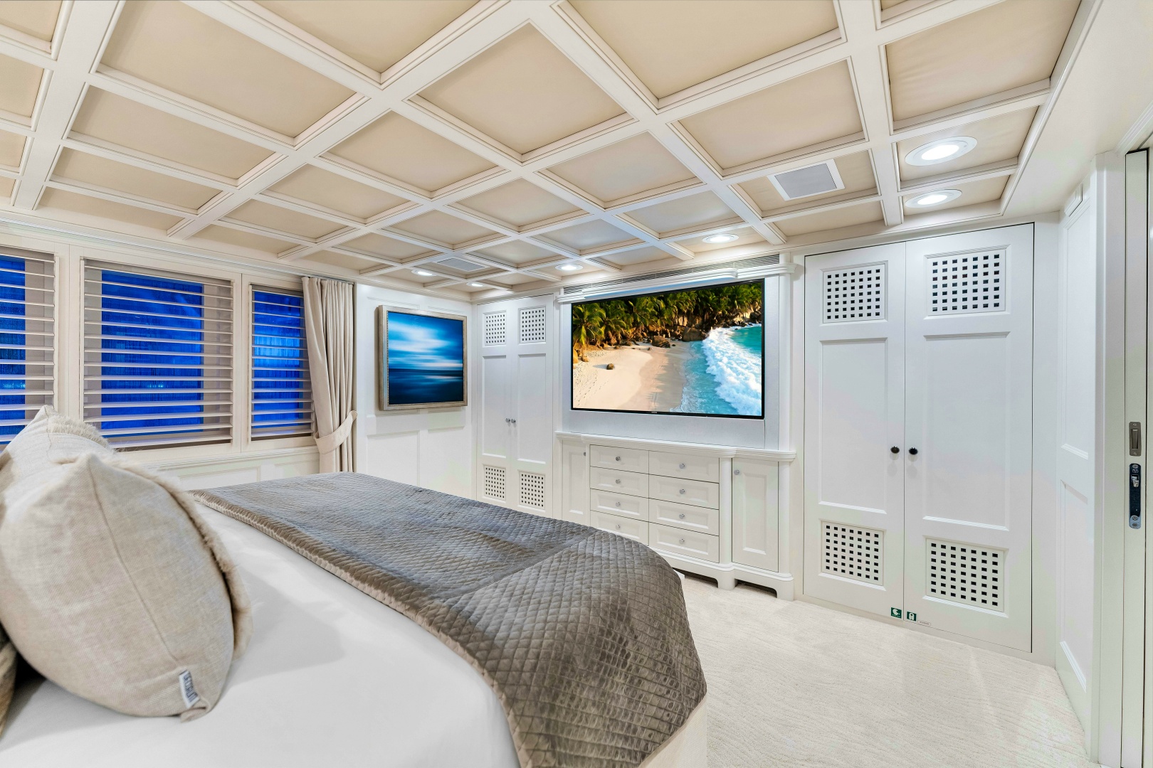 The Captain's cabin is located just starboard of the bridge and features a spacious desk, ensuite head, and a Jacuzzi tub/shower combination. Its strategic location near the bridge enhances safety and ensures the Captain is readily accessible while on charter or at sea.