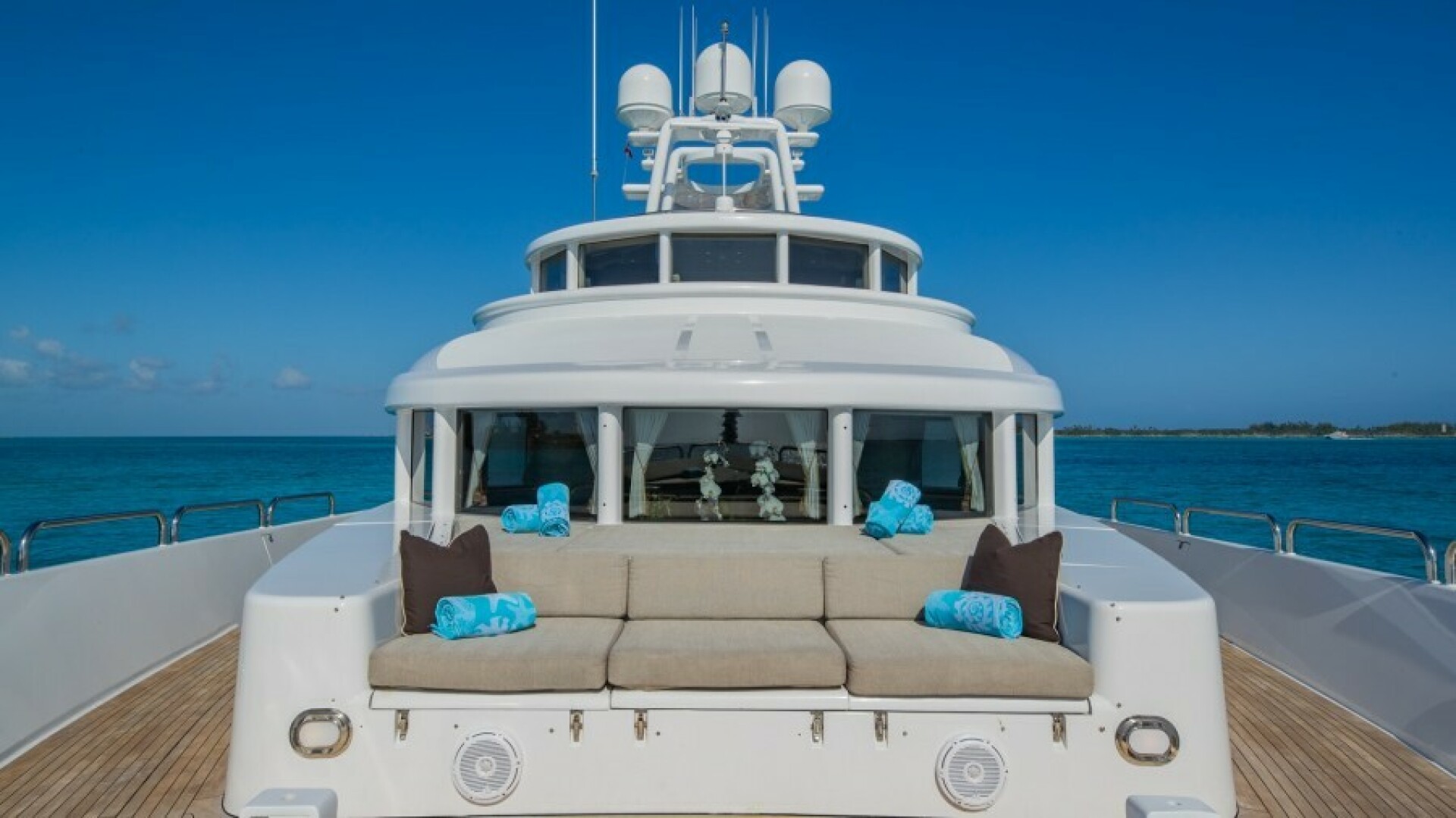 Centerline is a large square teak table with seating for 10. Aft of this table are chaise lounges, sofa, and small end tables. Aft of this is room for two jet skis and two 1,000 pound davits. Going up to the sundeck the Jacuzzi is centerline under the arch with seating forward. There is a sunpad starboard of the Jacuzzi and aft of this are large U-shaped seating to port and starboard. Aft of this is room for more jet skis, an inflatable tender and there is a 2,500 pound davit.
