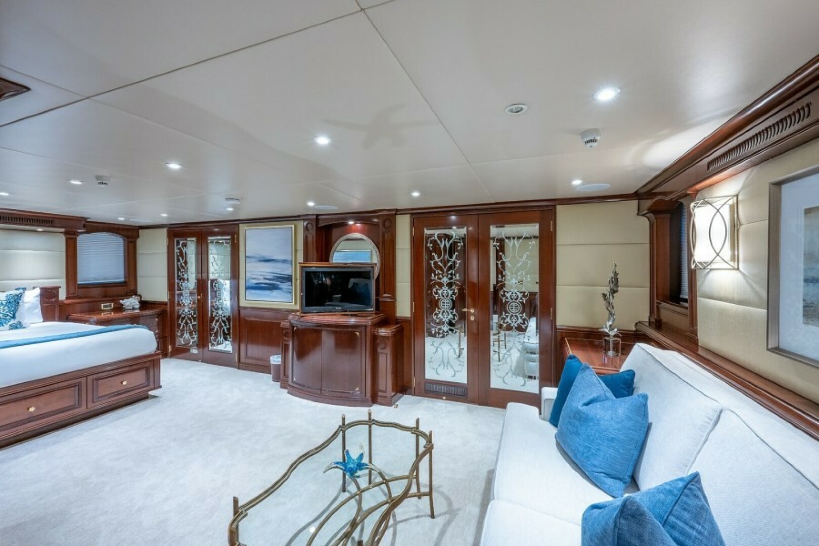 Stepping on board the swim platform, moving forward and centerline up a double wide staircase to the aft main deck. There is seating for six guests with a table on both the port and starboard side facing forward. Walking forward through double sliding glass doors you enter the main salon with bench seating on the port and starboard sides. Further forward to port is a large round glass dining table with seating for six guests. To starboard is a full-service bar with seating for four guests. The backlit onyx bar top is a highlight and topic of conversation. Forward of this is a banquette in the middle with port or starboard walk-around to a couch and four chairs. The mirror on the forward bulkhead reveals the television when retracted.