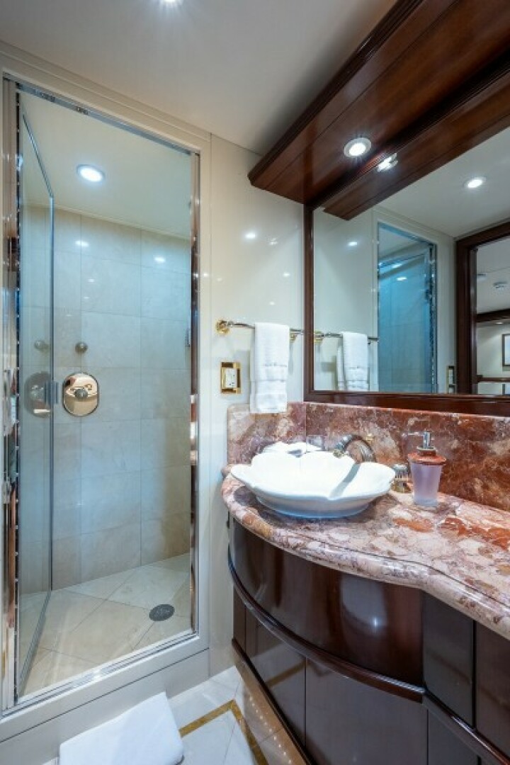 Going forward to port is the stairway down to the guest accommodations and next to that is the stairway up to the skylounge. Forward is the foyer with storage to starboard. At the forward end of the foyer is the dayhead to starboard and the entrance to the galley to port. Forward of this area are two steps up to a large circular dining area with 270 degree views and a large round dining table for 12 guests. Into the galley and forward to port are the steps leading down to the crew area. Back to the stairs leading down to the guest accommodations is the full beam owner’s suite forward (midship) with large bathroom forward centerline.