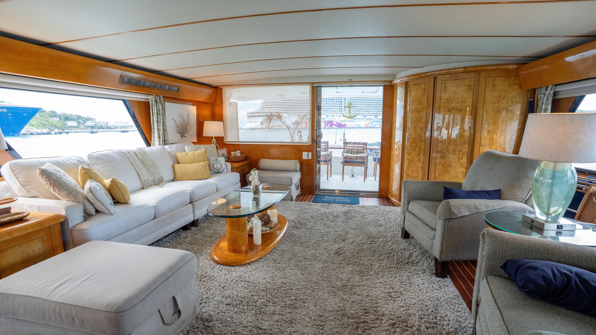 Step aboard Suite Life, a 1998 92’ Tarrab motor yacht, from the expansive aft deck, where you’re immediately welcomed into a refined outdoor living space designed for both relaxation and entertaining. This covered area features ample seating and direct access to the salon, creating a seamless transition between exterior and interior living. From here, wide side decks provide safe, easy movement forward, while the vessel’s solid build and thoughtful layout are immediately evident.