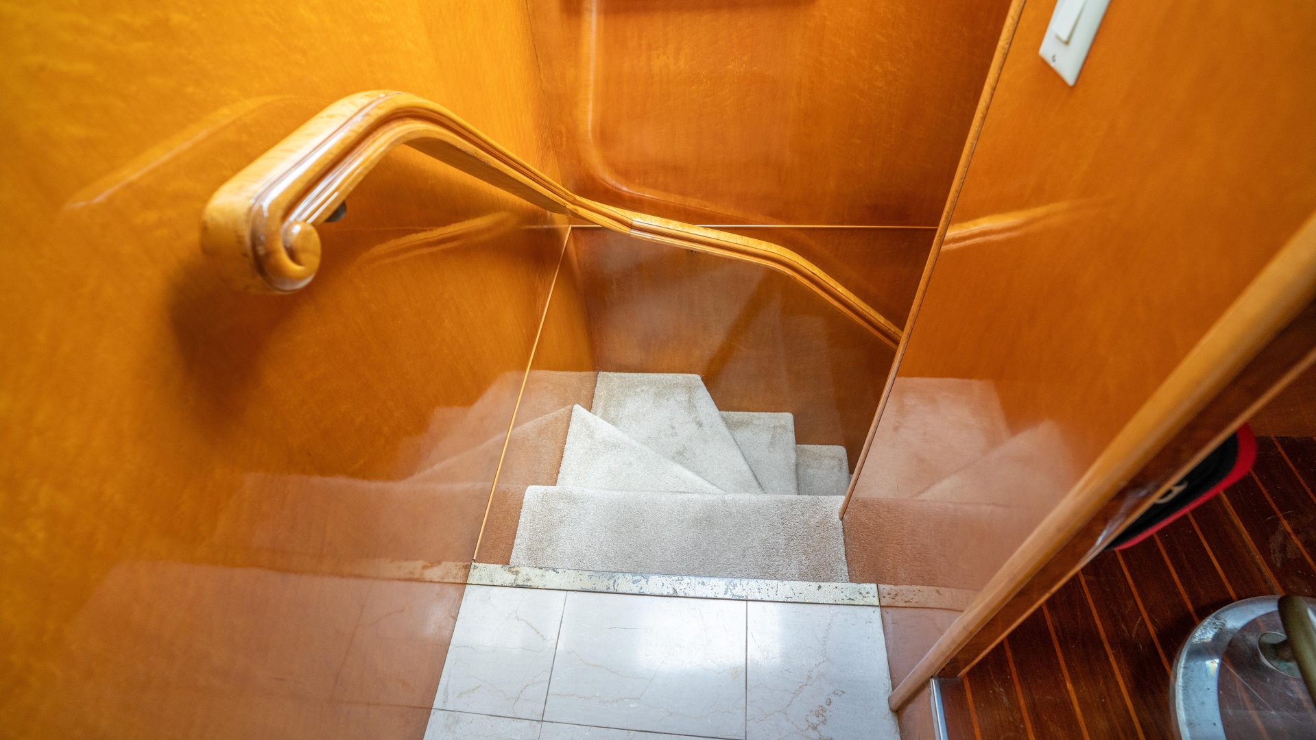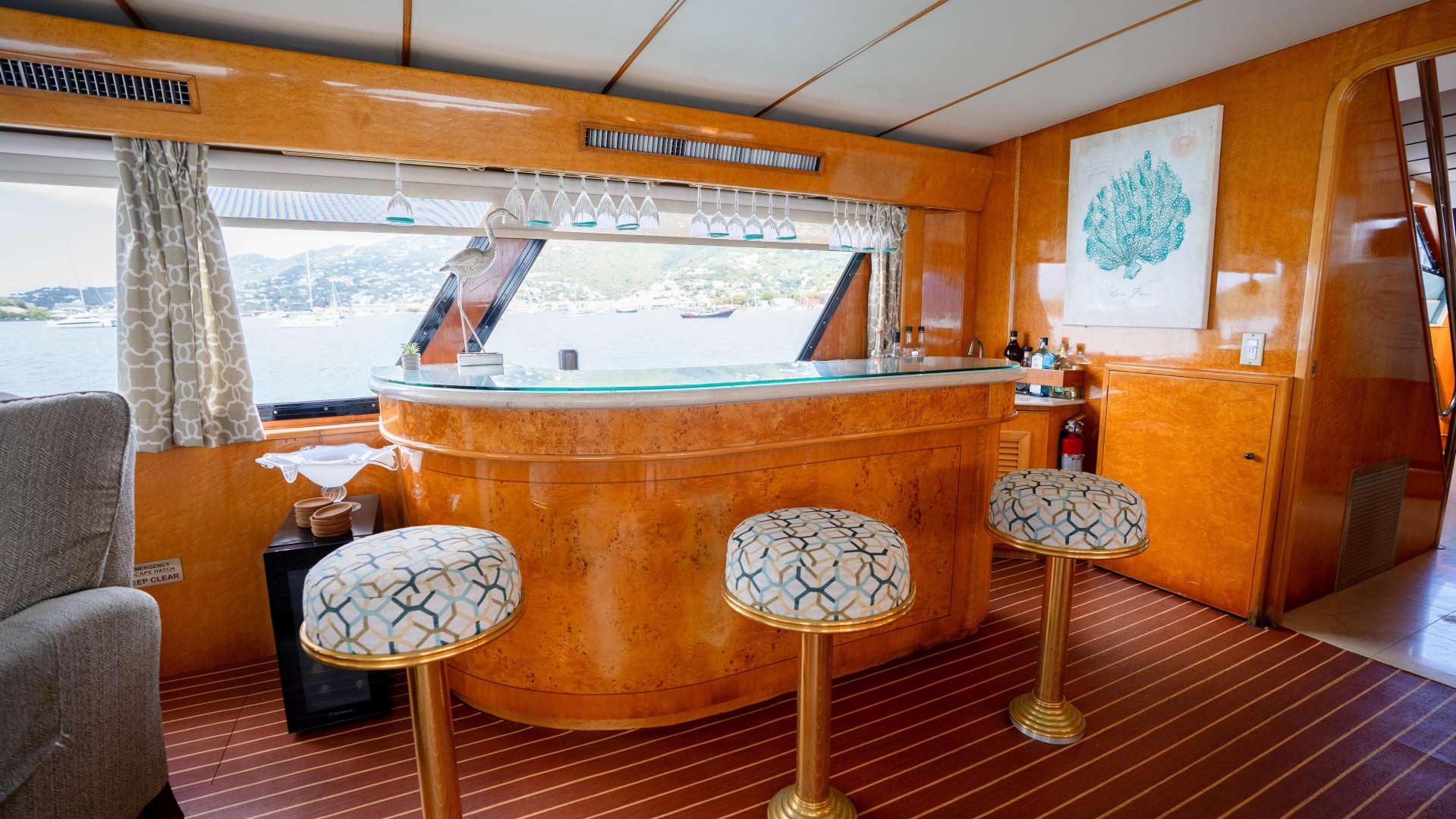Making your way up, the flybridge provides a commanding vantage point and an inviting social space. The helm is well-positioned with excellent visibility for navigation, while surrounding areas feature lounge seating, a bar, grill, and updated helm seating, making it an ideal spot for entertaining or enjoying panoramic views underway. Whether cruising the coast or anchored in a quiet bay, this elevated space enhances every moment onboard.