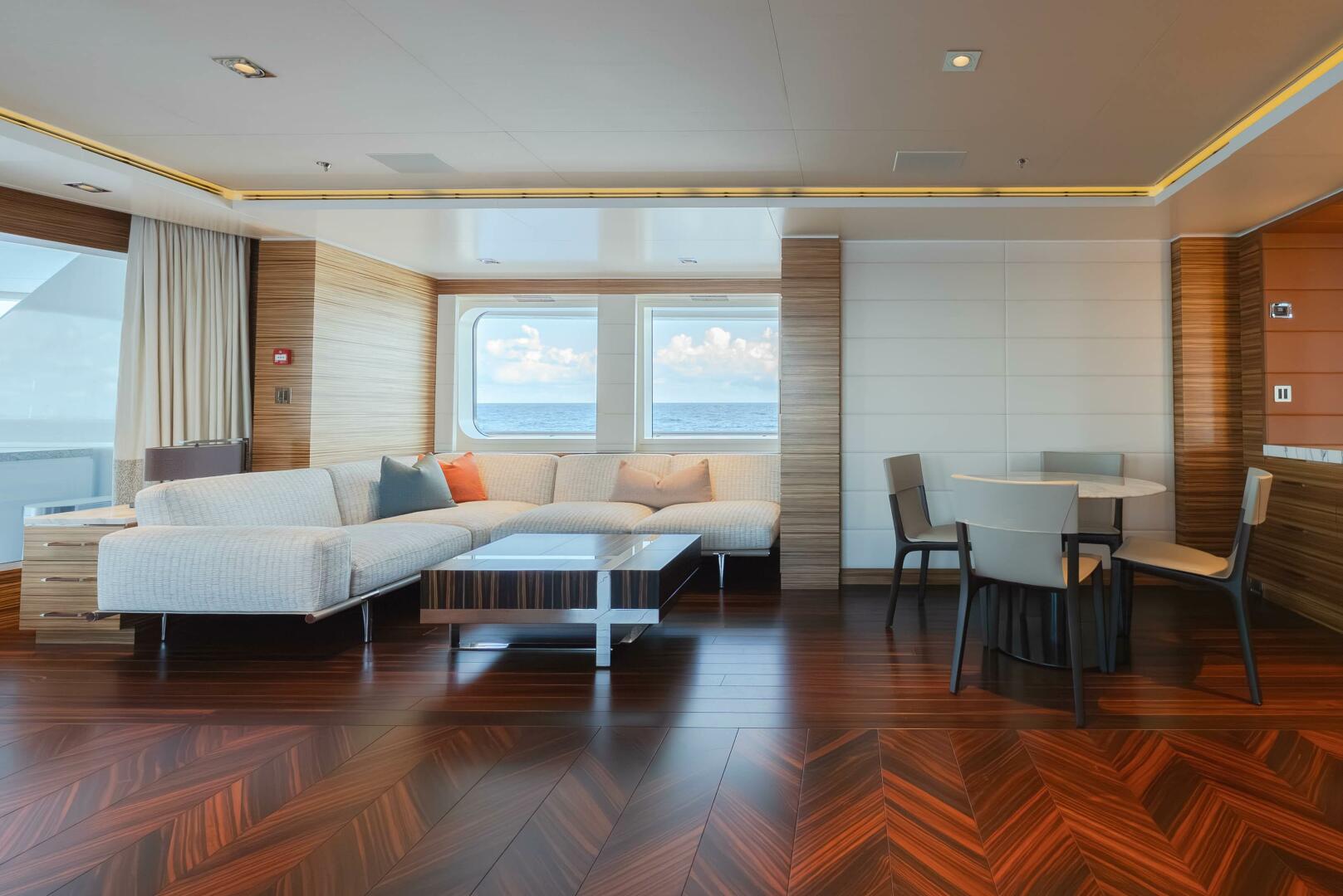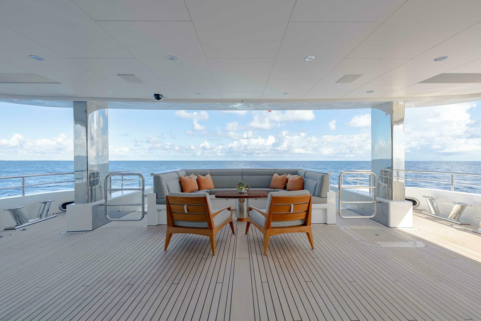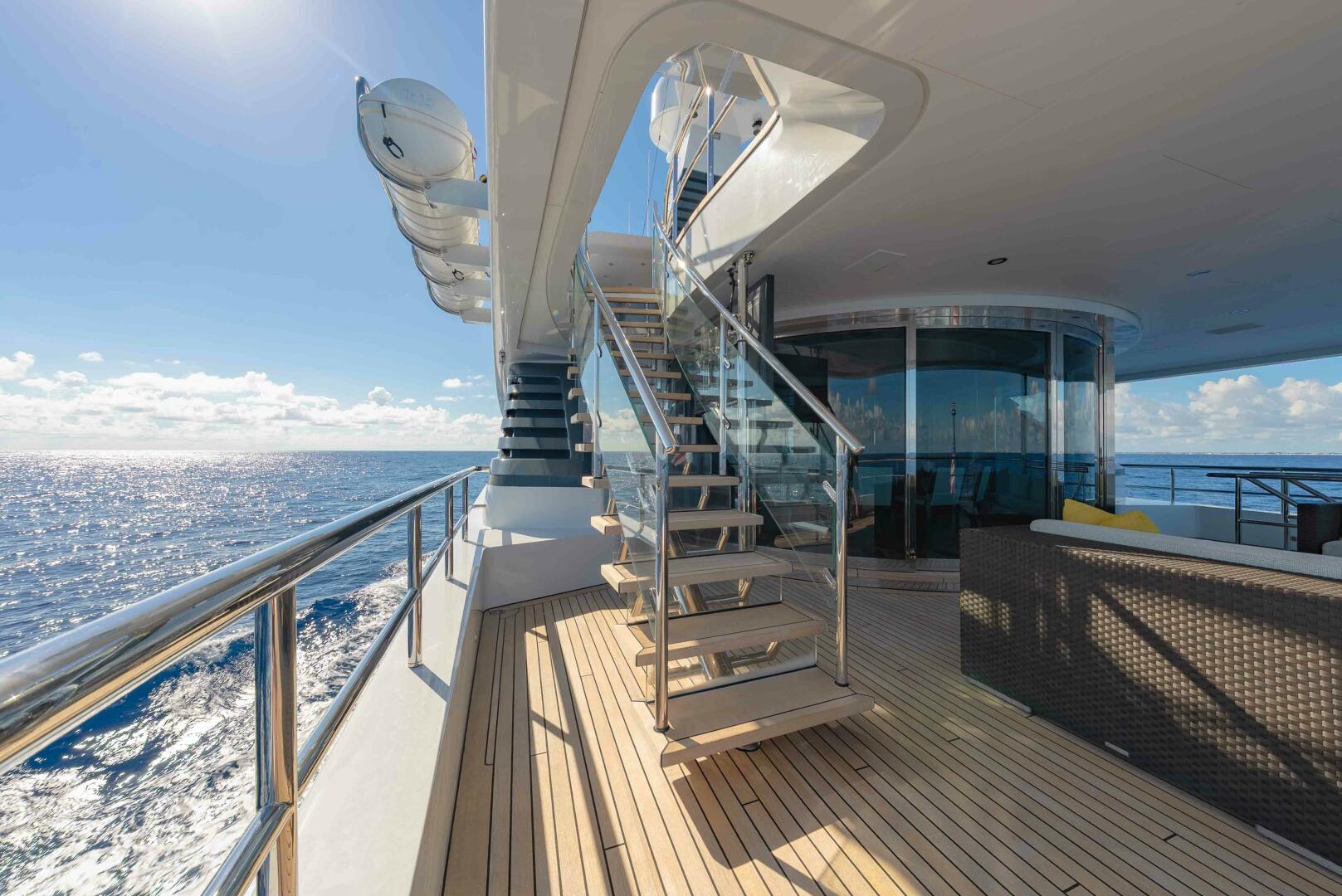 W boasts vast outdoor living areas, inviting guests to embrace the alfresco lifestyle. The sundeck serves as the heart of the yacht, perfect for basking in the sun. Enjoy multiple sunbathing spots, a large Jacuzzi, a shaded bar, and an outdoor dining area. Both bridge deck aft and main deck aft are equipped with comfortable lounging areas ideal for social gatherings.