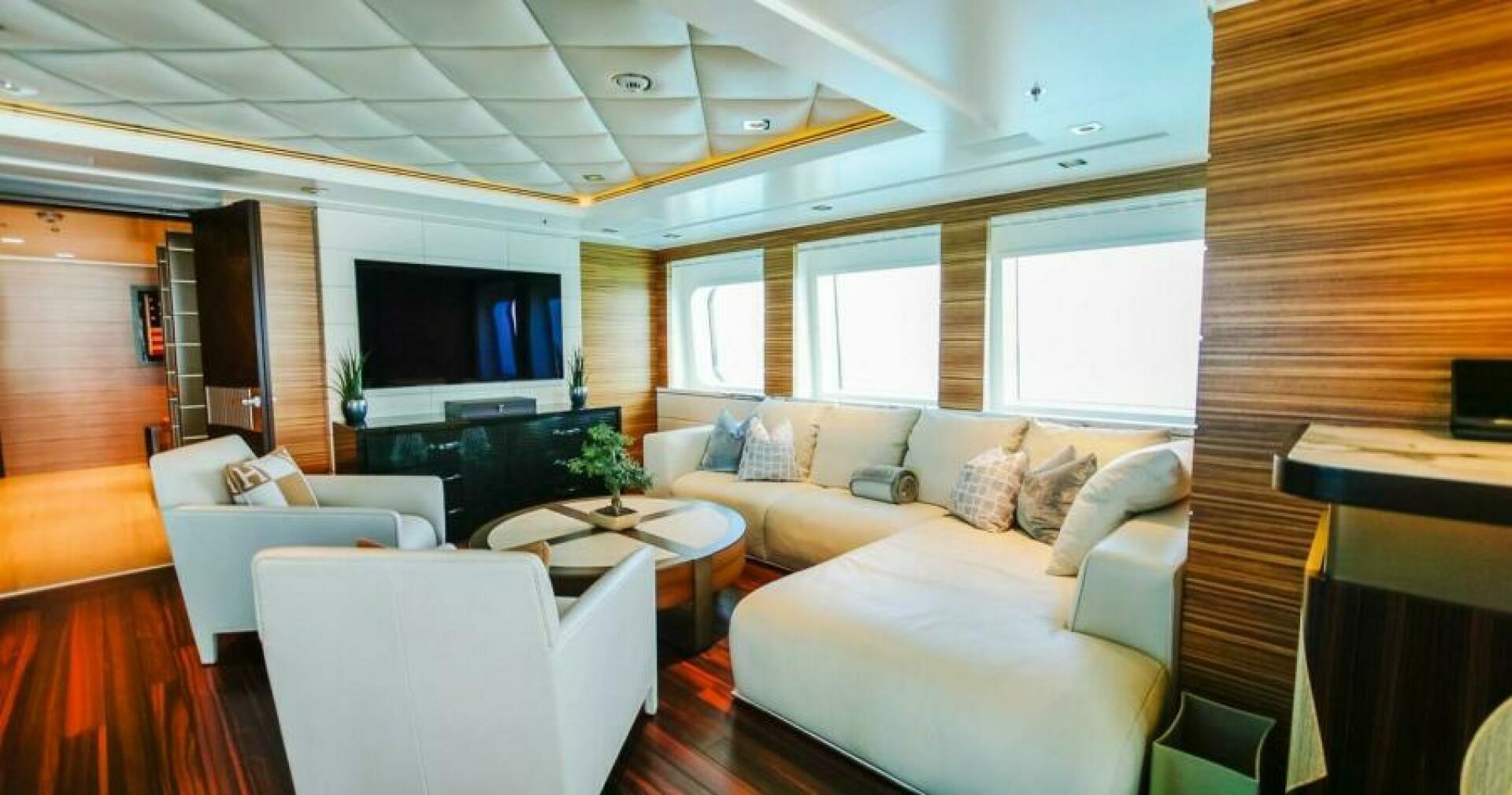 W’s interior was masterfully designed by Bannenberg & Rowell, complemented by touches from A La Mer during her refit. The decor exudes chic modern elegance while creating a relaxing ambiance. Guests will be captivated by the meticulous use of fine wood and stylish furnishings throughout the yacht. Both the main salon and bridge deck provide areas for socializing and relaxation, with the bridge deck featuring a versatile dining area that seamlessly invites the outdoors in, thanks to fully retractable doors for an alfresco dining experience.