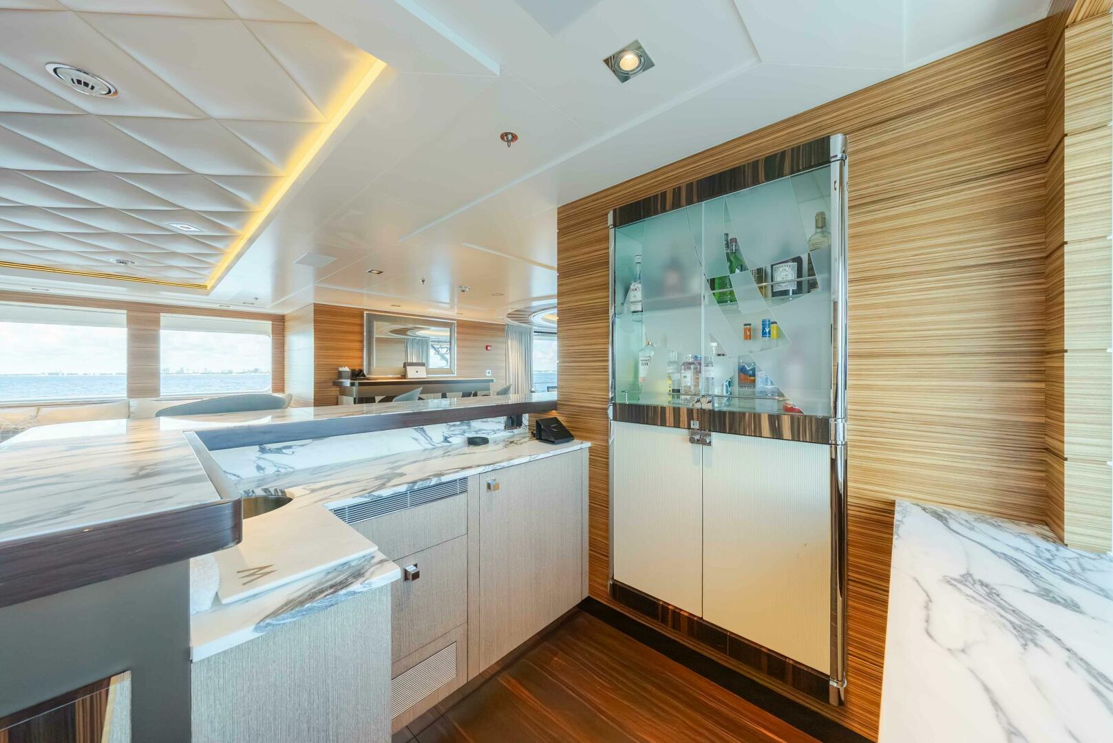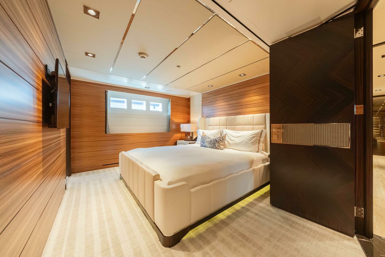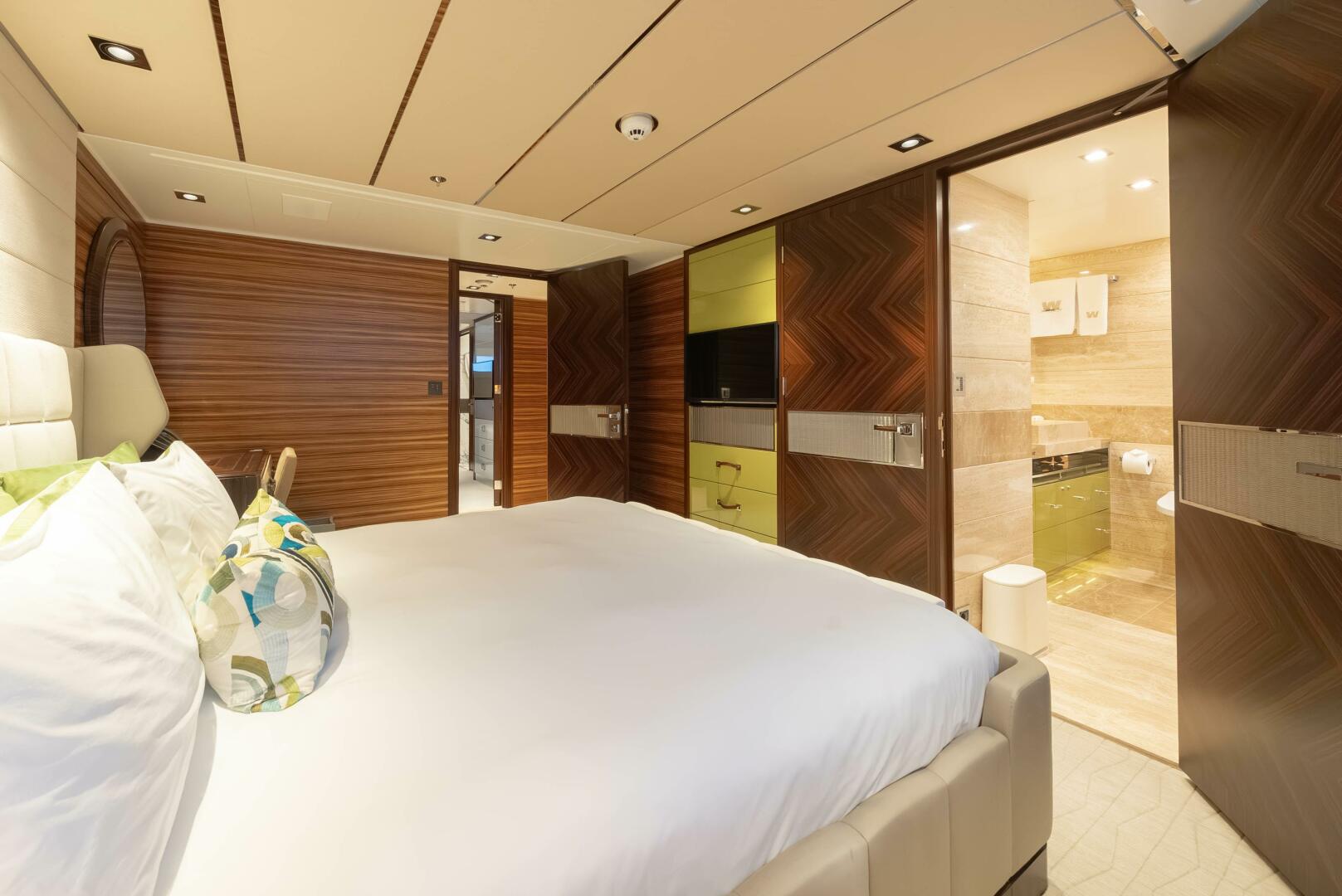 W’s interior was masterfully designed by Bannenberg & Rowell, complemented by touches from A La Mer during her refit. The decor exudes chic modern elegance while creating a relaxing ambiance. Guests will be captivated by the meticulous use of fine Makassar wood flooring and Zebrano wall timbers among the stylish furnishings throughout the yacht. The bridge deck bar front is covered in bleached wenge, Makassar, and Sycamore marquetry with the salon tops in Arabescato (bright white). Both the main salon and bridge deck provide areas for socializing and relaxation, with the bridge deck featuring a versatile dining area that seamlessly invites the outdoors in, thanks to fully retractable doors for an alfresco dining experience.