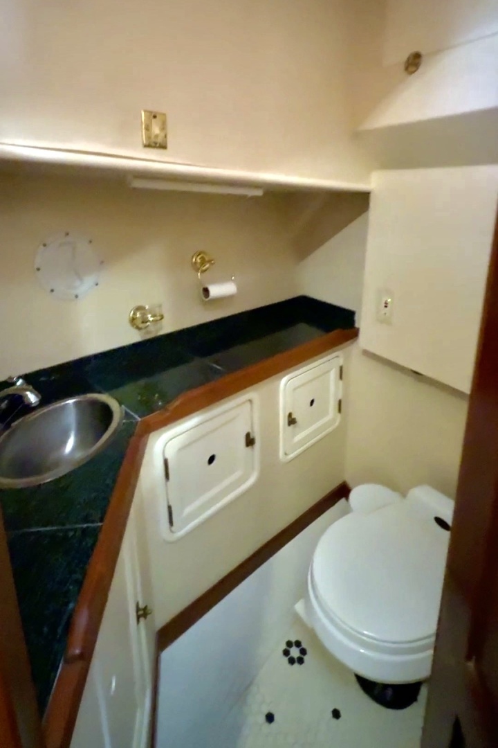 The master stateroom aft is accessed via a separate companionway and features a centerline queen berth, generous drawer storage, hanging lockers, and built-in bedside cabinetry. Multiple opening portlights and an overhead hatch provide excellent natural light and ventilation. The ensuite head includes a vanity, sink, and additional storage, completing a comfortable and private owner’s space.