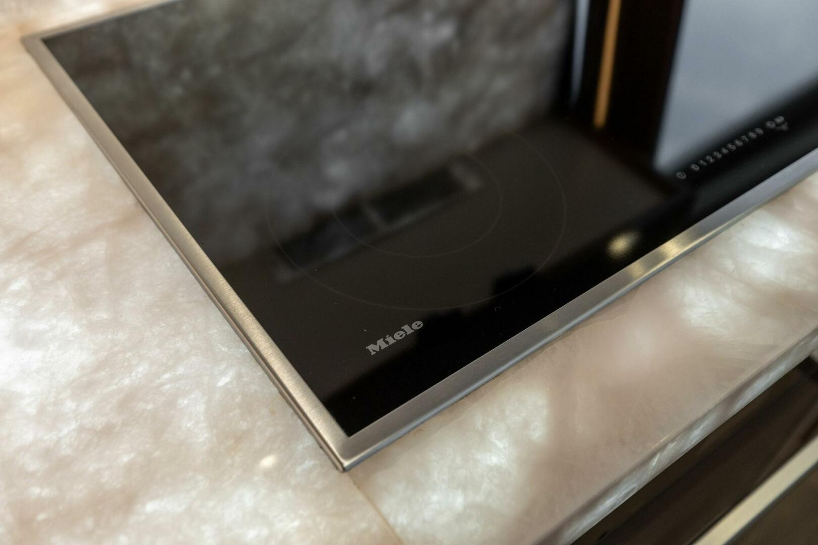 - Corian quartz vanity top, full height backsplash, Versilia Grigio