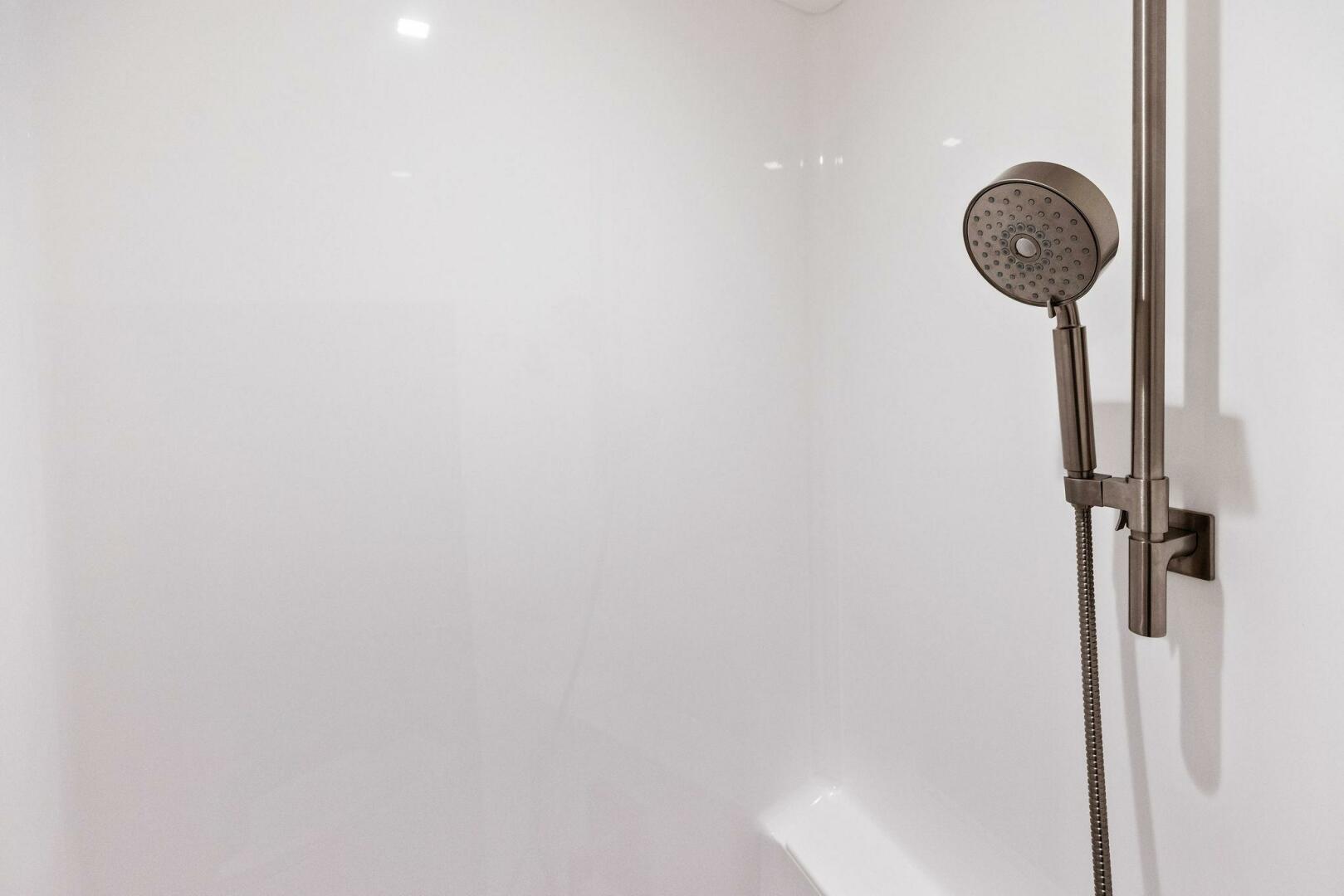 - Corian quartz vanity top, full height backsplash Versilia Grigio