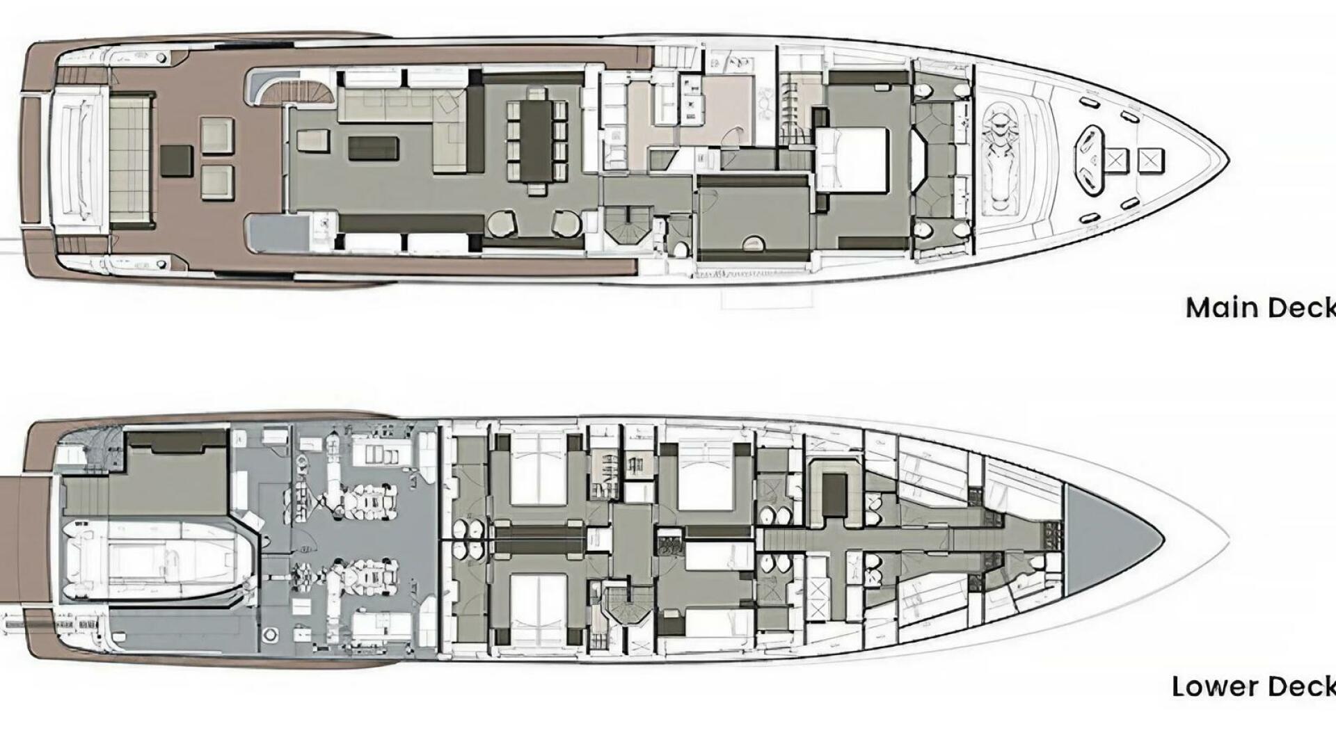 The exterior deck is designed for seamless indoor-outdoor living, combining elegance with functionality for cruising or charter. Expansive teak surfaces and multiple lounging areas provide comfort and panoramic sea views, while the aft beach club offers direct water access for swimming or tender operations. Thoughtful integration of hydraulic systems, lighting, and storage ensures ease of use and safety, creating a versatile and luxurious outdoor environment that complements the yacht’s refined interior.
