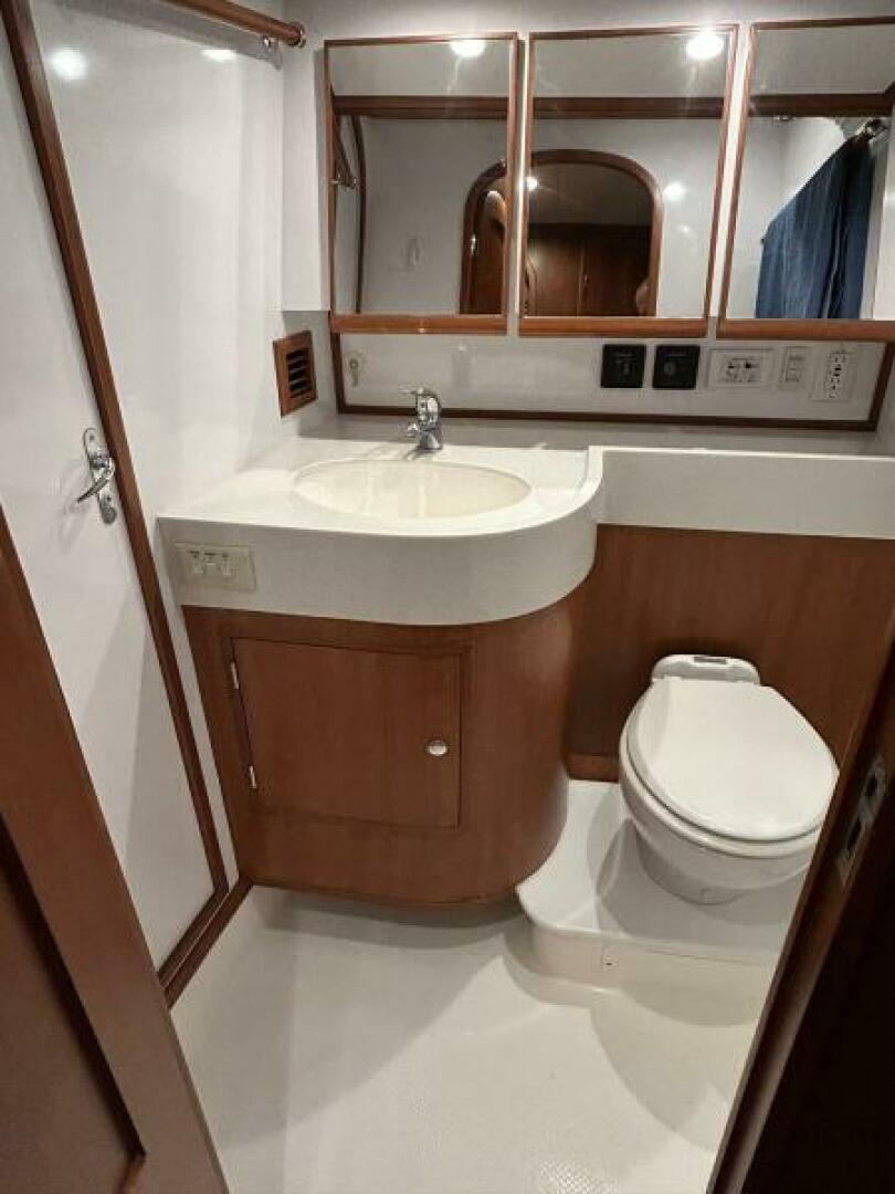 A private head with separate shower stall is found along the port side forward and features a Raritan freshwater electric toilet, Corian counters, vanity mirror and linen closet. There are two opening portholes.