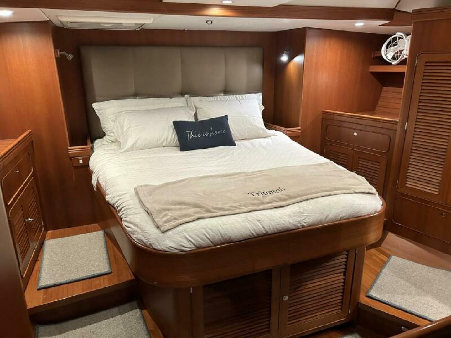 The owner's private stateroom is located aft and features a large, nearly king-sized berth on centerline, with gas piston assisted lifts to easily access storage space and equipment. There is a vanity to port and generous storage including (2) large hanging lockers, drawers and numerous cabinets. A built-in bureau is forward with flat screen TV above, and a B&G 9”multi-function display (new 2024) forward starboard. Extended beam is carried well aft to create a spacious, open cabin accentuated by a deck hatch and (4) opening portholes.