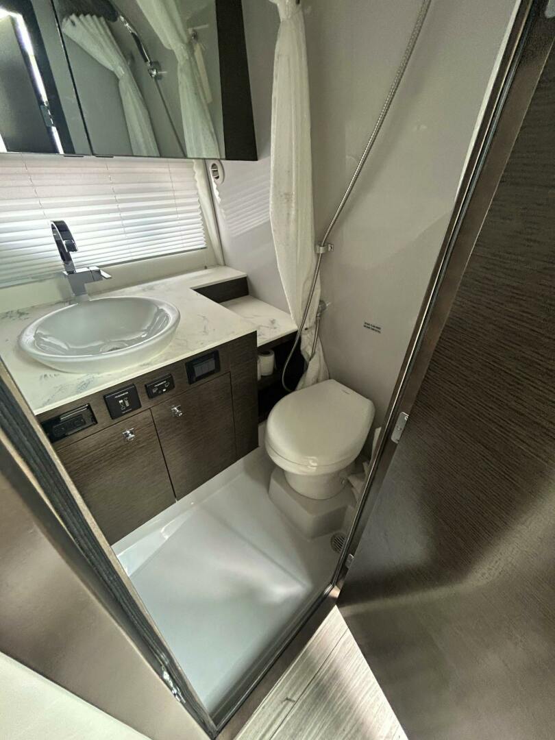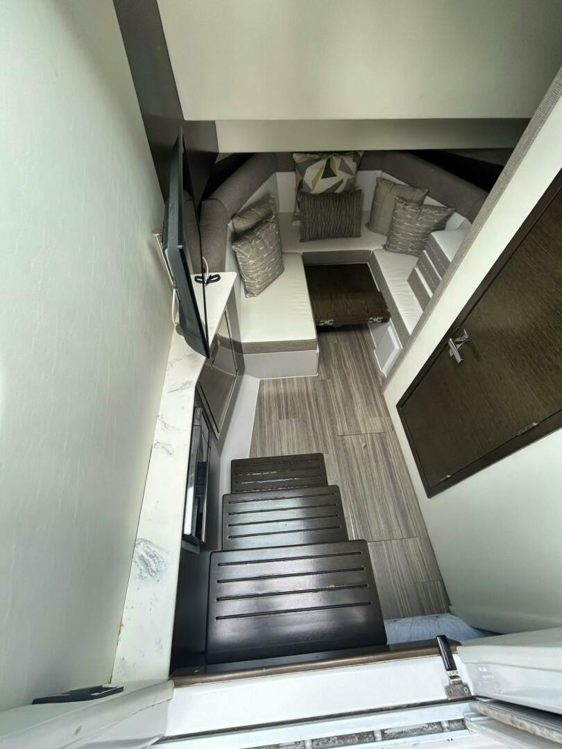 Below deck, you'll find a stylish and functional lower cabin with an aft stateroom and a U-shaped dinette that easily converts into an additional berth. A full galley and a standing head with shower make overnight stays both comfortable and convenient. This extraordinary yacht combines open-air freedom with refined interior design—making TRUE the ultimate choice for adventure and leisure.