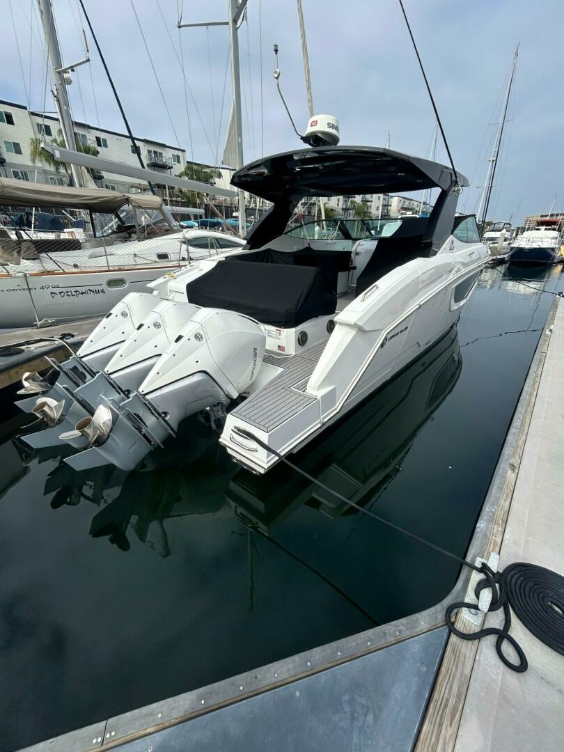 Powered by triple 300 HP Mercury Verado outboards with joystick steering, this yacht offers impressive speed, agility, and effortless docking. The signature beach door lowers to transform into an extended swim platform, dramatically expanding your connection to the water.